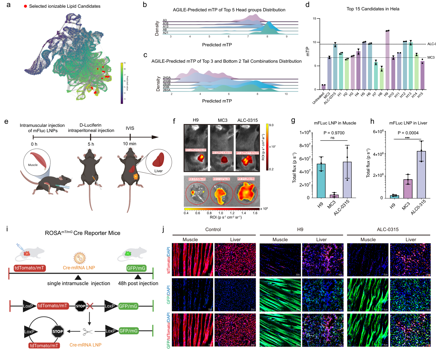 为了进一步验证AGILE模型的预测准确性,我们选择了部分预测性能较好的离子化脂质进行了实验验证。具体来说,我们利用脂质纳米粒(LNP)制备技术将这些脂质分子包裹在LNP中,并在HeLa细胞中进行了体外转染实验。实验结果显示,AGILE模型预测的转染效率与实验测得的转染效率高度一致,验证了模型的预测准确性。此外,我们还发现了一些在实验验证中表现出优异性能的离子化脂质,如H9等,这些脂质有望成为新一代mRNA递送系统的候选材料。