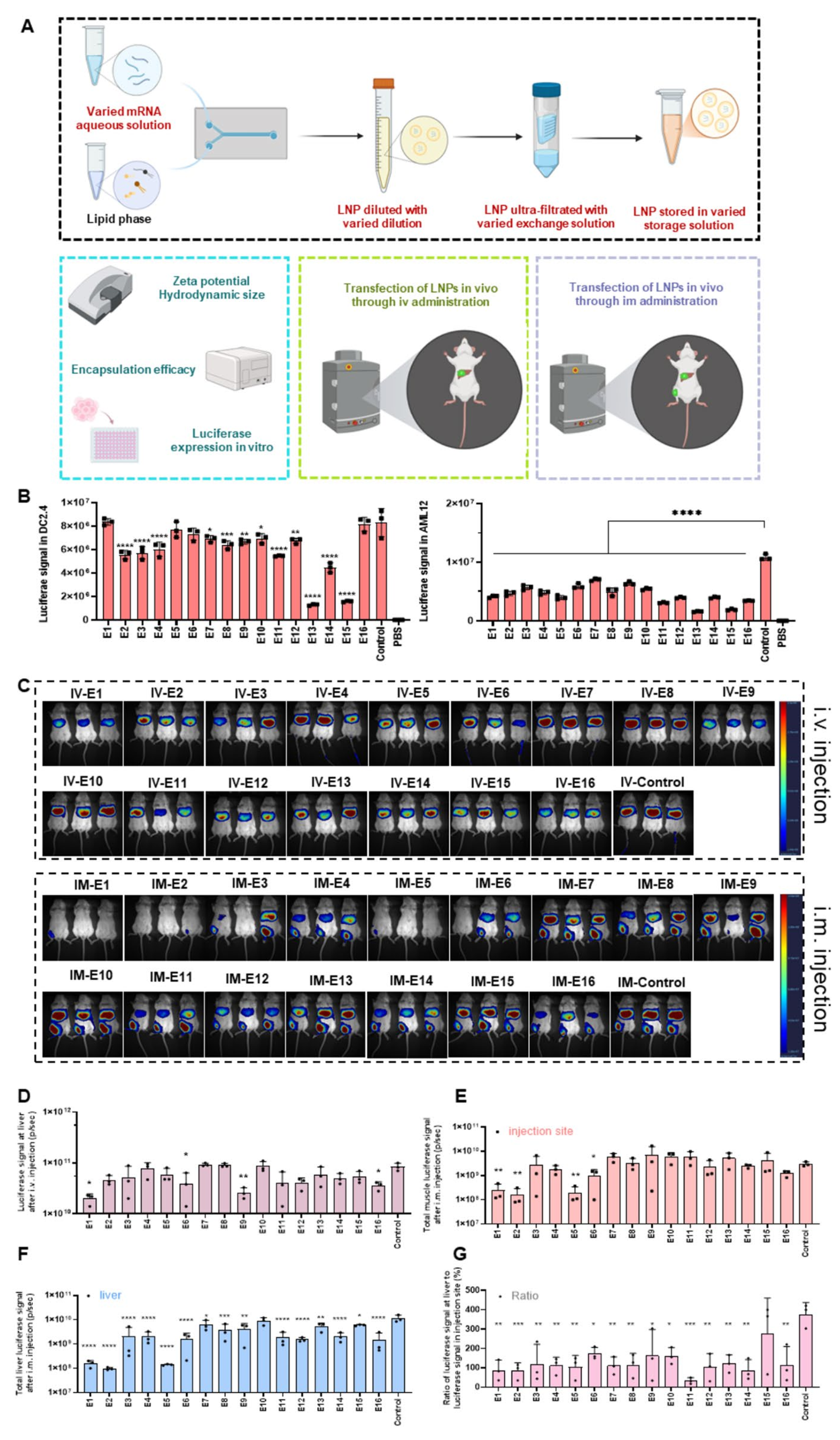 在综合考虑上述结果的基础上,研究进一步探讨了不同制备溶液组合对LNPs性能的影响,并选用了文献常用的LNP制备方式作为对照组(即mRNA水相溶液=pH 4的柠檬酸缓冲液,稀释、超滤和保存液都选用1X PBS)。结果显示,不同制备溶液组合对LNPs的粒径、PDI、zeta电位和EE有显著影响。在体外转染实验中,少数组合表现出与对照组相当的转染效率,但是实验组的包封率和冷冻稳定性均显著好于对照组。在体内实验中,不同组合的LNPs表现出显著不同的表达效率和体内分布特点。特别是,超滤溶液的pH值对体内表达效率有显著影响。随着pH值的升高,无论肌肉给药还是静脉给药,LNP的肝脏特异性表达都越高。此外,冻融稳定性实验表明,虽然LNP最后都保存在含有蔗糖的溶液中,但是不同制备溶液组合的LNPs在冻融过程中的稳定性存在显著差异,E15组合表现出较好的稳定性。这些结果表明,最终的保存条件不是影响LNP冷冻稳定性的唯一因素,制备过程也会显著影响LNP的稳定性,优化制备溶液的成分对于提高LNPs的冻融稳定性至关重要。