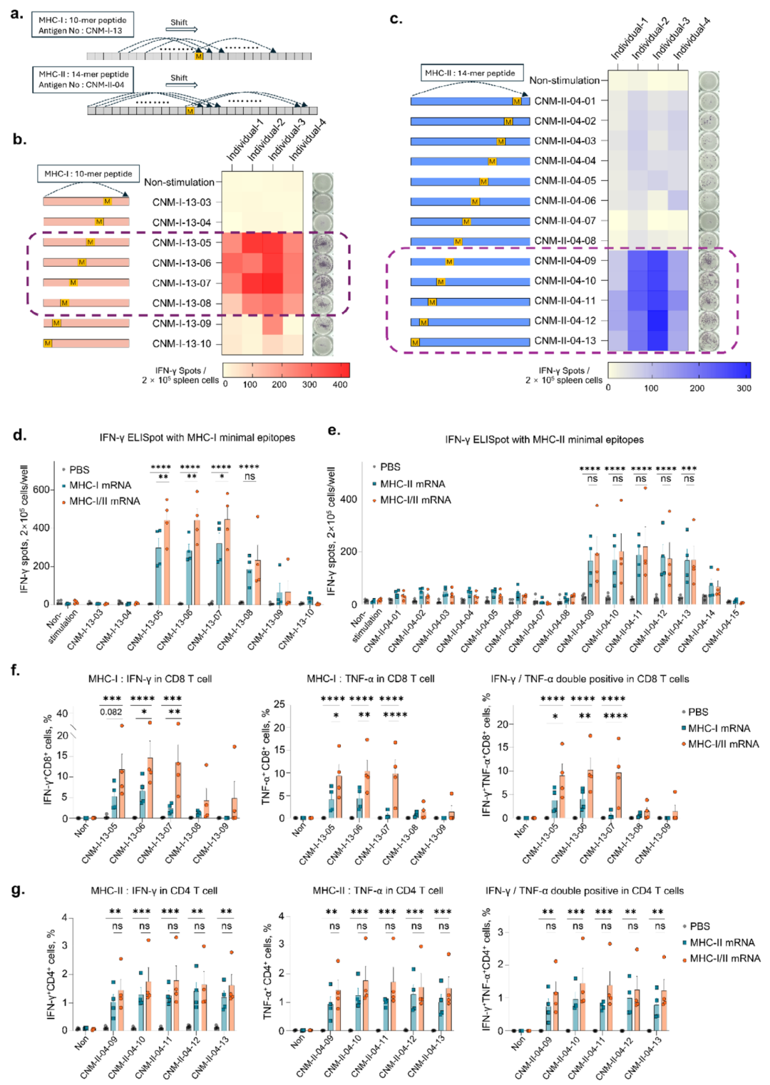 为了确定最小表位,设计了MHC-I抗原(CNM-I-13)内的10-mer肽(CNM-I-13-01至CNM-I-13-10)和MHC-II抗原(CNM-II-04)内的14-mer肽(CNM-II-04-01至CNM-II-04-13),包括每个突变(图3a)。发现CNM-I-13-05、-06、-07和-08在MHC-I限制性抗原中具有高度免疫原性(图3b),而CNM-II-04-09、-10、-11、-12和-13在MHC-II限制性抗原中强烈诱导抗原特异性IFN-γ分泌(图3c)。