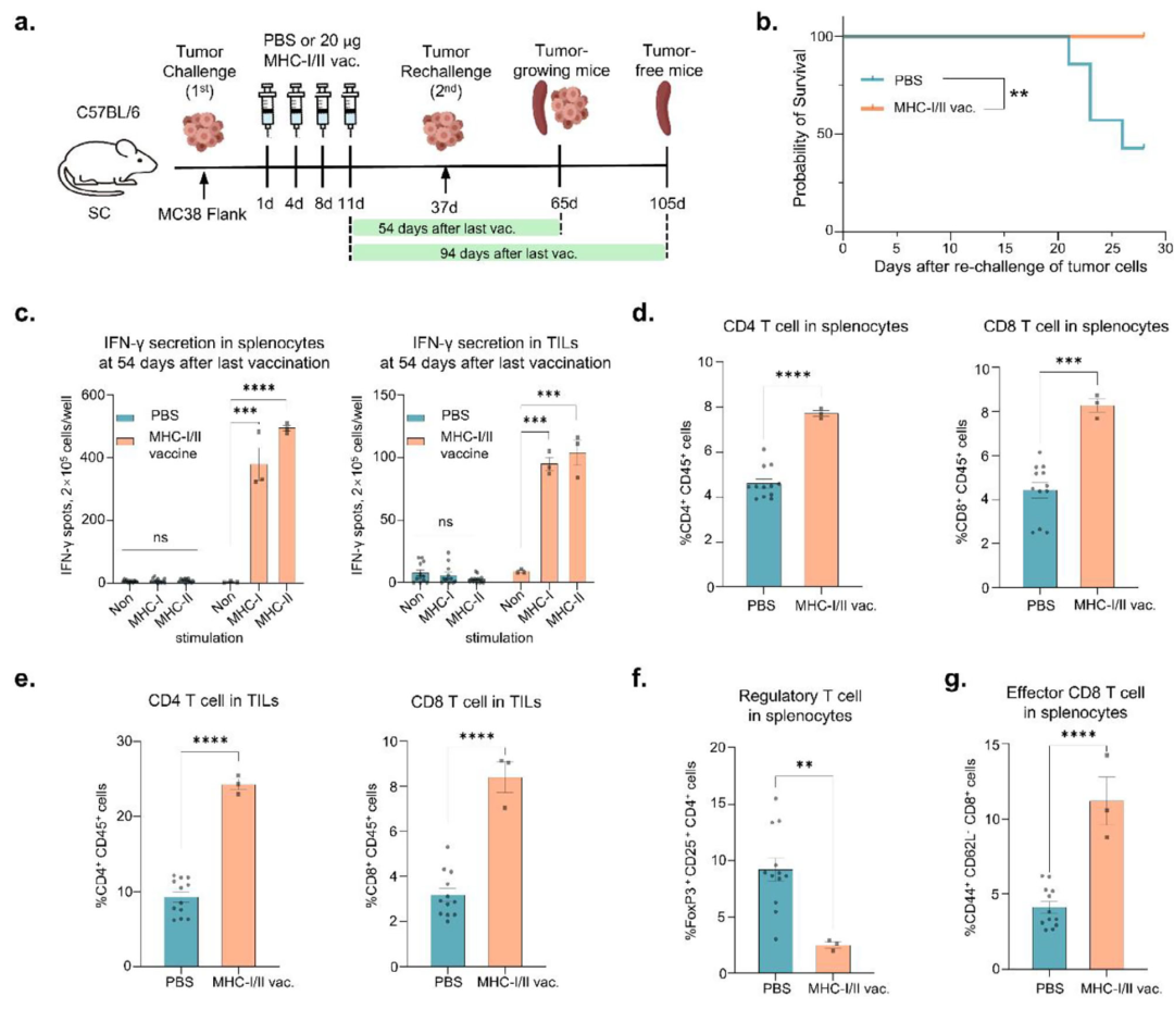 为了测试mRNA疫苗在预防肿瘤复发方面的效果,对肿瘤小鼠进行手术切除,并注射PBS或联合递送MHC-I和MHC-II mRNA疫苗(图5a)。与PBS处理组相比,mRNA疫苗处理组肿瘤复发显著减少(图5b)。此外,通过每周一次给予PBS或MHC-I/MHC-II疫苗,持续三周,测试了预防性接种的抗癌效果。与对照组相比,接受mRNA基础新抗原疫苗处理的小鼠肿瘤生长显著减少,无瘤小鼠数量增加。IFN-γ ELISpot分析确认了预防性接种后新抗原特异性IFN-γ分泌,表明产生了强烈的免疫反应。