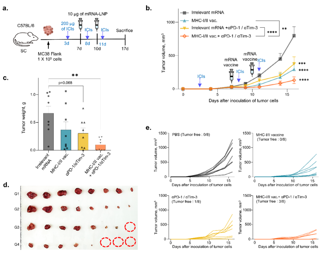 鉴于mRNA疫苗增加了免疫检查点分子的表达,我们在结肠癌模型中进行了mRNA疫苗与ICIs的联合治疗。C57BL/6小鼠右侧接种1×10^5个MC38结肠癌细胞后,分别在第3、8和11天给予200μg ICIs(抗小鼠PD-1和Tim-3抗体),在第7和10天给予10μg mRNA疫苗,或两者联合(图8a)。值得注意的是,与对照组相比,mRNA疫苗和ICIs处理组的肿瘤生长显著减少(图8b,c)。联合治疗组的肿瘤生长抑制比单独使用mRNA疫苗或ICIs更为显著(图8b,c)。此外,在联合治疗组中,三只小鼠的肿瘤完全消退,突显了对肿瘤生长抑制的协同效应(图8d,e)。