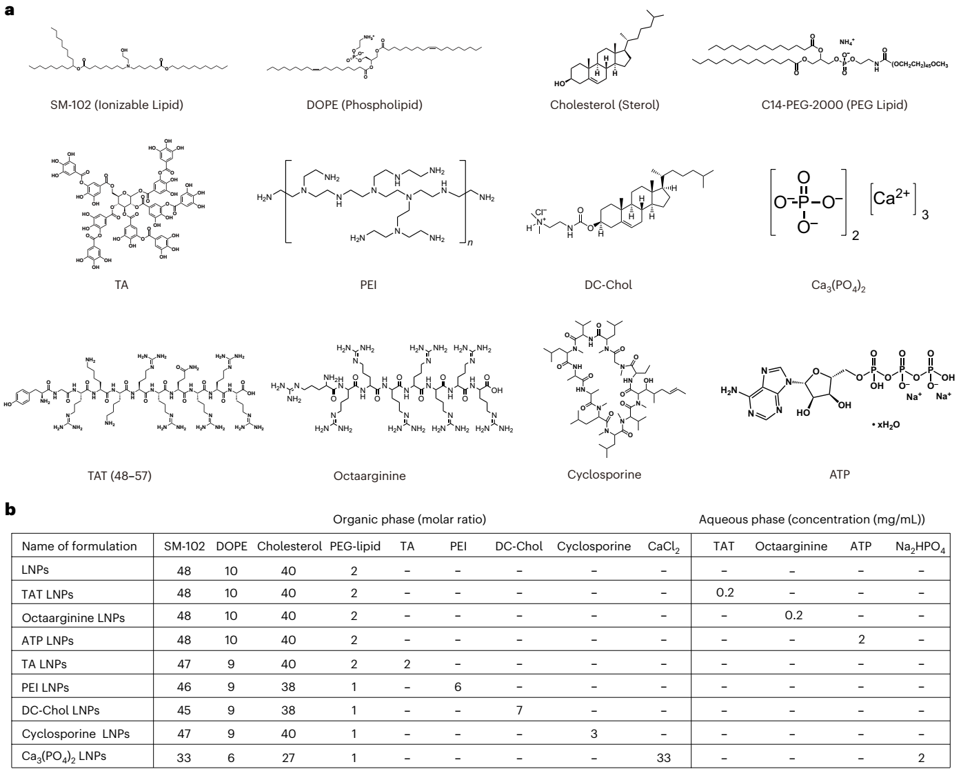研究使用商业可用的离子化脂质SM-102,基础LNP配方为SM-102、DOPE、胆固醇和C14-PEG-2000,摩尔比为48:10:40:2。通过微流控混合技术制备mRNA- LNP,该技术通过将有机相(包含离子化脂质、磷脂、胆固醇和PEG脂质)与水相(包含mRNA)以可调速率混合,实现批次间的一致性。为了证明方案可以应用于制备和评价各种mRNA LNP配方,实验还制备了添加辅料的mRNA LNPs。并可在基础 mRNA 制剂的有机相中添加其他辅料,如单宁酸 (TA)(摩尔比为 47:9:40:2:2)、聚乙烯亚胺 (PEI)(摩尔比为 46:9:38:1:6)、DC-胆固醇-盐酸盐(DC-Chol)(摩尔比为 45:9:38:1:7)、环孢素(摩尔比为 47:9:40:1:3)或氯化钙(CaCl2)(摩尔比为 33:6:27:1:33),整个脂质混合溶液中有五种成分。还可将其他辅料以 1:1 wt% 的比例与 mRNA 混合加入水相中,如 HIV-TAT 1(TAT,转录肽的反式激活剂,0. 2 mg/mL)、八精氨酸(0.2 mg/mL)、5′-三磷酸腺苷(ATP)(2 mg/mL)和 Na2HPO4(2 mg/mL)稀释在柠檬酸缓冲液(10 mM pH 3)中。