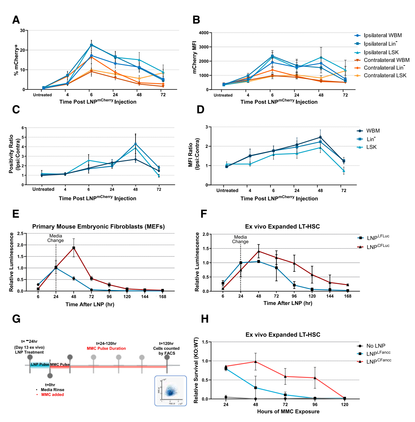 结果显示,LNP-Fancc处理显著提高了Fancc缺陷HSPCs对MMC的抵抗性(图1B-C, E-F)。这表明LNP-Fancc处理能够有效恢复Fancc缺陷HSPCs的DNA修复能力,从而增强其对烷基化剂的抵抗性。