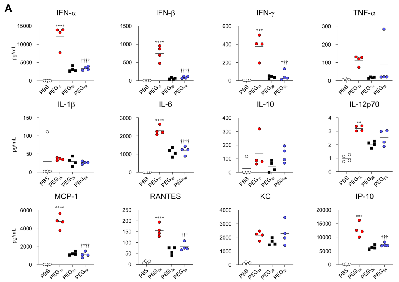 Figure 3. Effect of chain length of PEG on inflammatory cytokine production and adverse reactions induced by mRNA-LNPs.