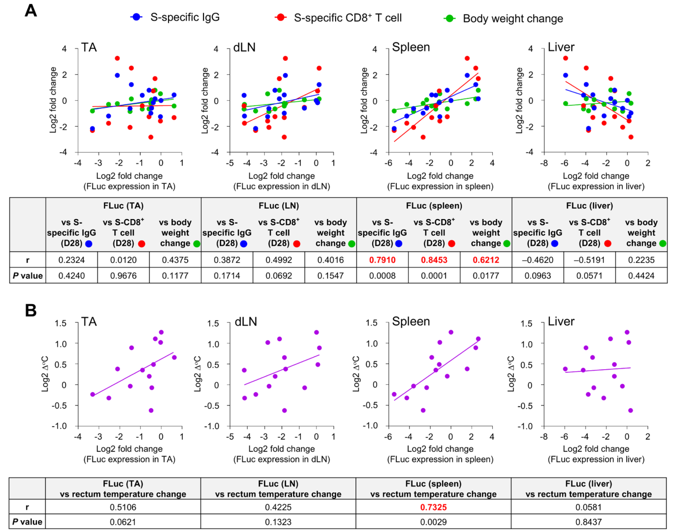 蛋白表达与免疫反应的正相关:分析显示,脾脏中的FLuc(荧光素酶)表达水平与S特异性IgG抗体的产生、S特异性CD8+T细胞诱导之间存在显著的正相关。这意味着,当mRNA-LNP在脾脏中表达较高水平的蛋白时,机体产生的特异性抗体和T细胞反应也更强。
