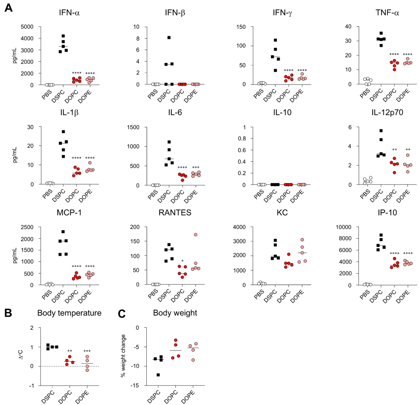 Figure 9. Effect of replacement of phospholipid on inflammatory cytokine production and adverse reactions induced by mRNA-LNPs.