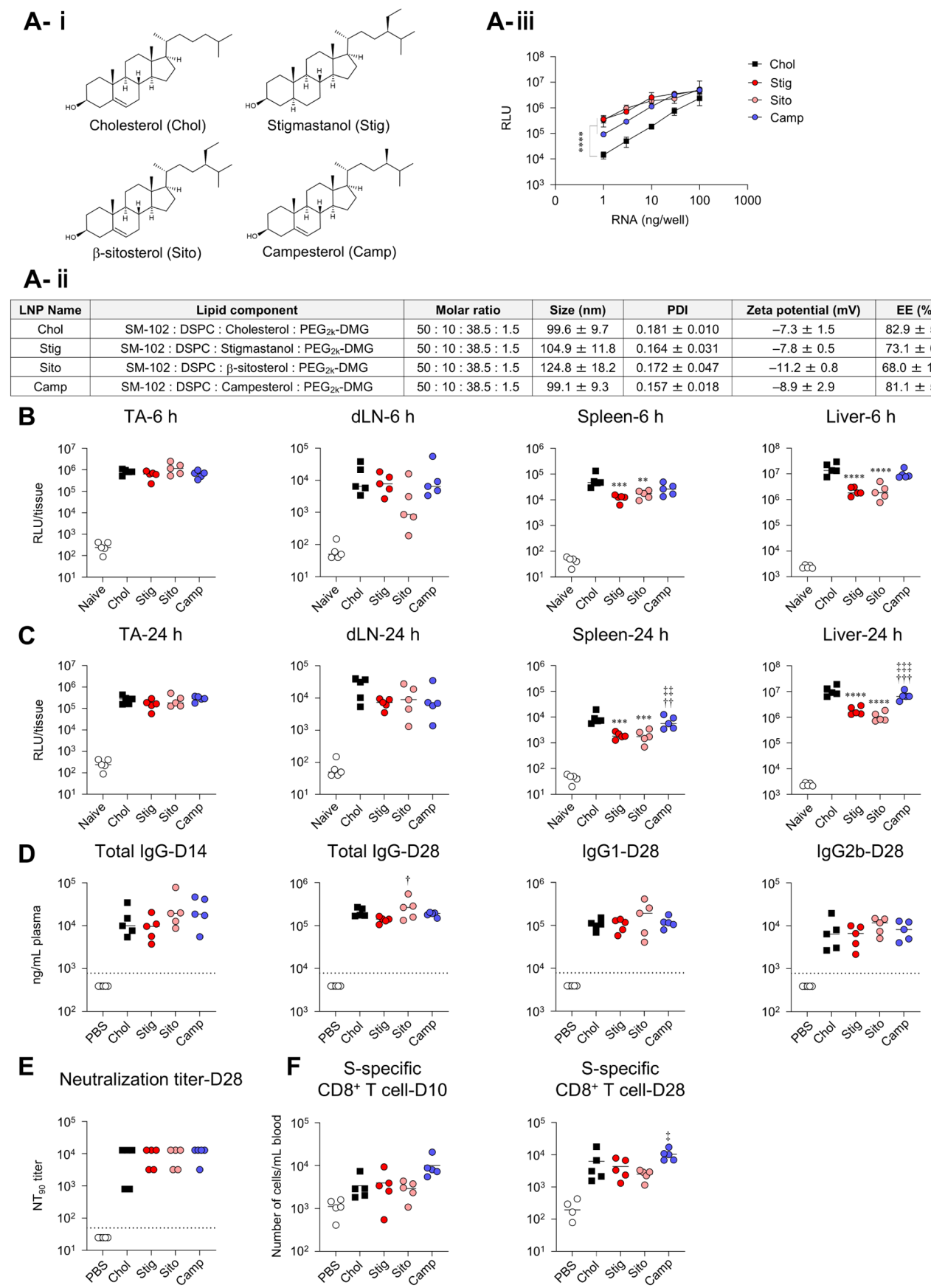 研究评估了用植物甾醇(豆甾醇、β-谷甾醇、菜籽甾醇)替代胆固醇对mRNA-LNP疫苗体内蛋白表达的影响。实验结果显示,在注射后6小时和24小时,不同胆固醇类似物修饰的LNP在各组织中的FLuc活性无显著差异(图6B, C)。这表明胆固醇类似物的替代在短期内对mRNA体内表达的影响较小。
