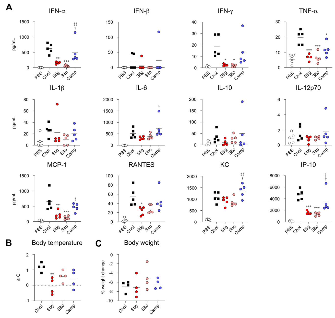 Figure 7. Effect of replacement of cholesterol with naturally occurring cholesterol analogs on inflammatory cytokine production and adverse reactions induced by mRNA-LNPs.