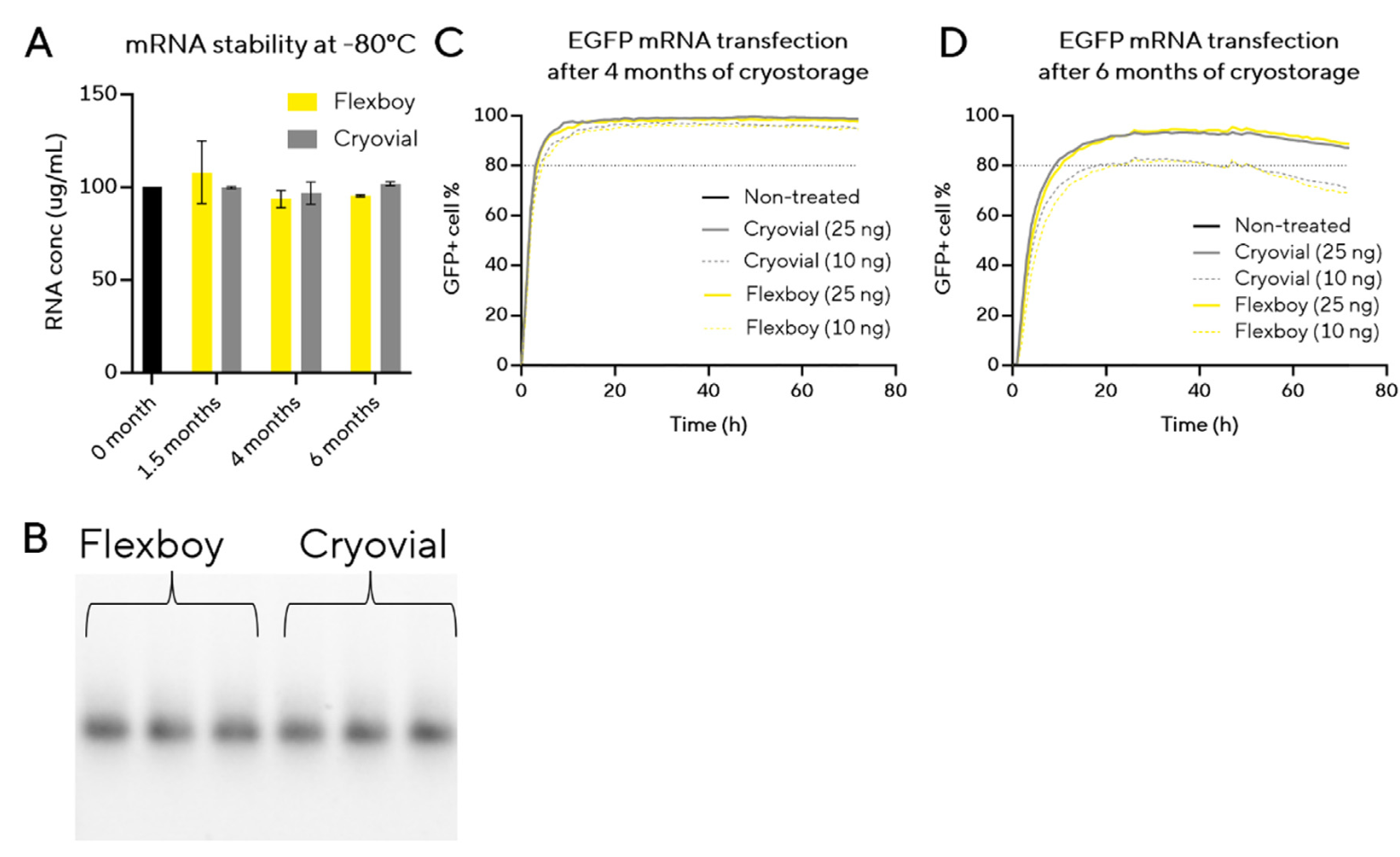 为了全面评估SU袋在mRNA储存中的适用性,研究还研究了mRNA单独在Flexboy袋中的长期稳定性。实验结果显示,当mRNA在-80°C条件下储存六个月后,其浓度保持稳定(图4A)。同时,琼脂糖凝胶电泳分析表明,储存后的mRNA保持了良好的完整性,未出现明显的降解条带(图4B)。