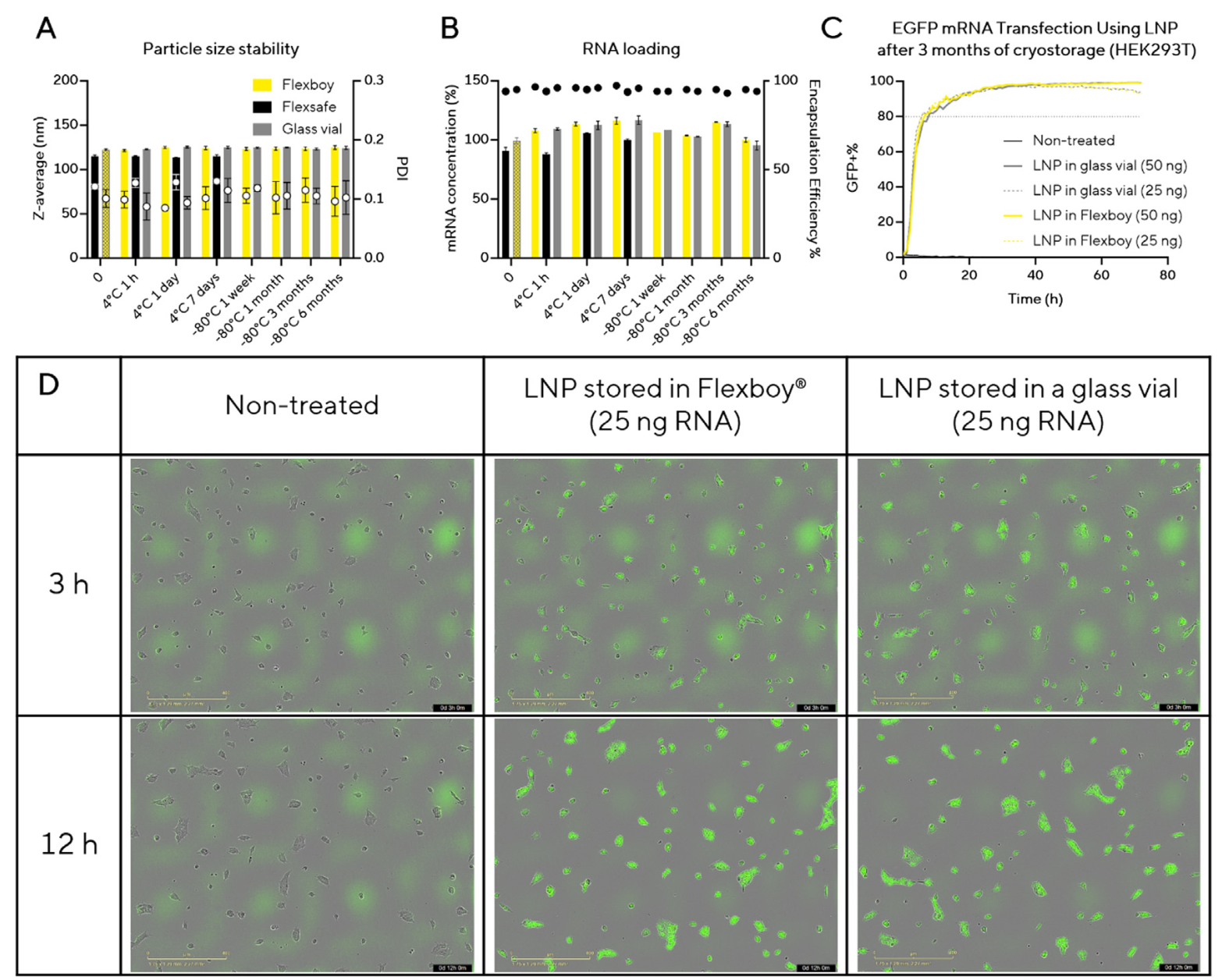 在本研究中,研究评估了mRNA负载的脂质纳米颗粒(LNPs)在一次性使用(SU)袋中的长期稳定性。实验结果显示,当LNPs在-80°C条件下储存在Flexboy袋中六个月后,其粒子大小和mRNA浓度均保持稳定(图2A、B)。具体而言,粒子大小在储存前后未发生显著变化,表明LNPs在低温条件下具有良好的物理稳定性。同时,通过RiboGreen检测测定的mRNA浓度也保持稳定,进一步验证了LNPs在长期储存过程中对mRNA的保护作用。
