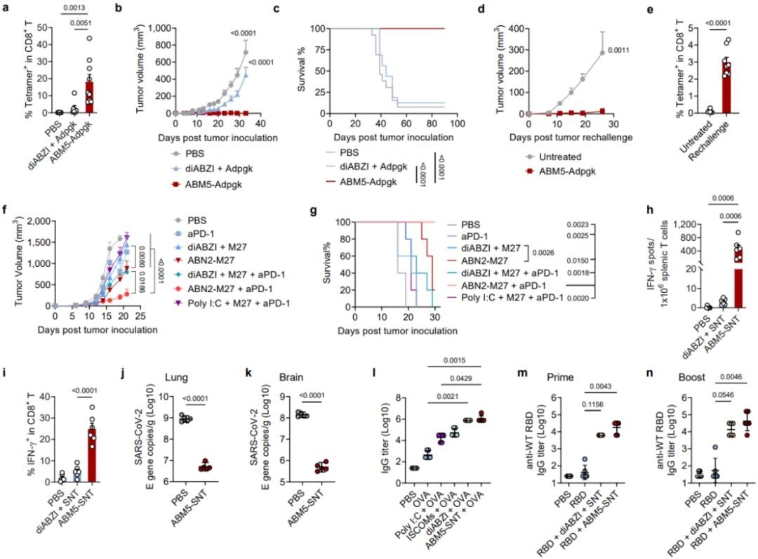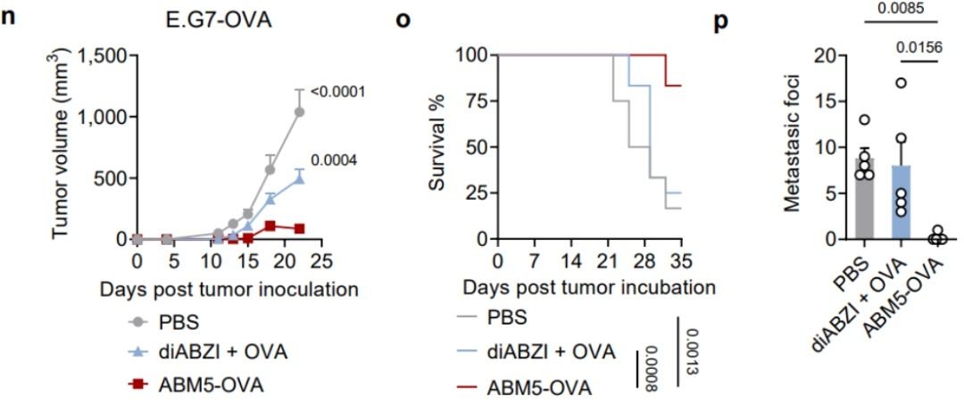 抗肿瘤:在黑色素瘤、淋巴瘤等模型中,SABER疫苗显著抑制肿瘤生长,小鼠生存率提升至100%(对照组仅10%存活);