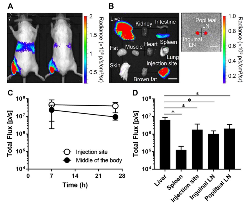 肌肉注射64Cu标记的mRNA-LNPs后,注射部位保留了高放射活性,24小时后仍有约27%ID残留(图5A-C)。肝脏和脾脏的积累浓度约为3-4%ID/g,膀胱中检测到超过10%的注射放射性,表明有尿液排泄。此外,通过离体放射性生物分布测量,发现腹股沟和腘窝淋巴结中有显著的放射性积累(图5D)。生物发光成像显示,注射部位、肝脏、脾脏和淋巴结均有荧光素酶表达,其中肝脏的表达强度最高(图6A-D)。