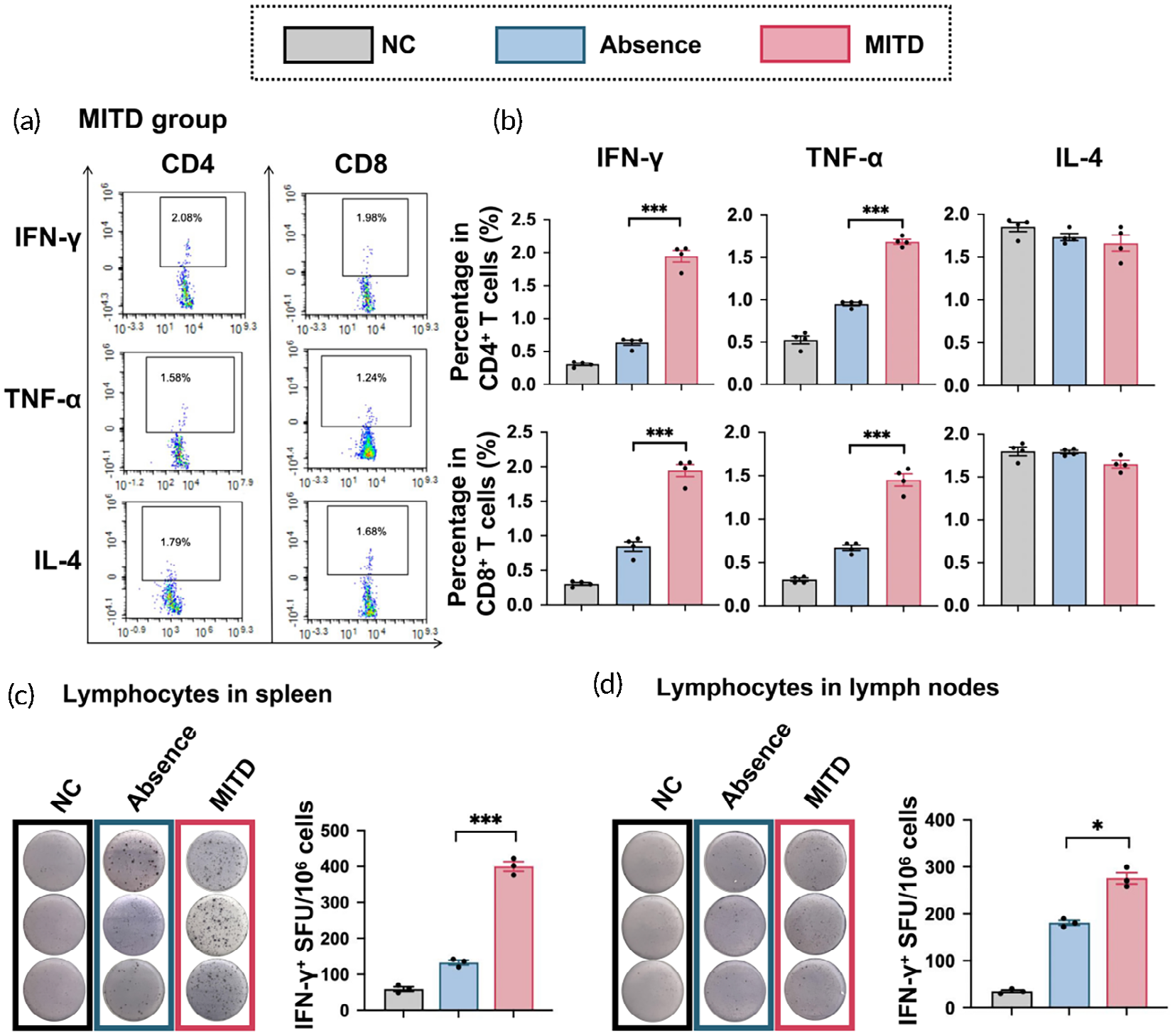 ELISpot试验进一步证实,含MITD的疫苗组脾脏和淋巴结中分泌IFN-γ的T细胞数量显著多于无MITD组(图4c,d)。这表明MITD不仅增强了T细胞的激活,还促进了其功能性的细胞因子分泌。