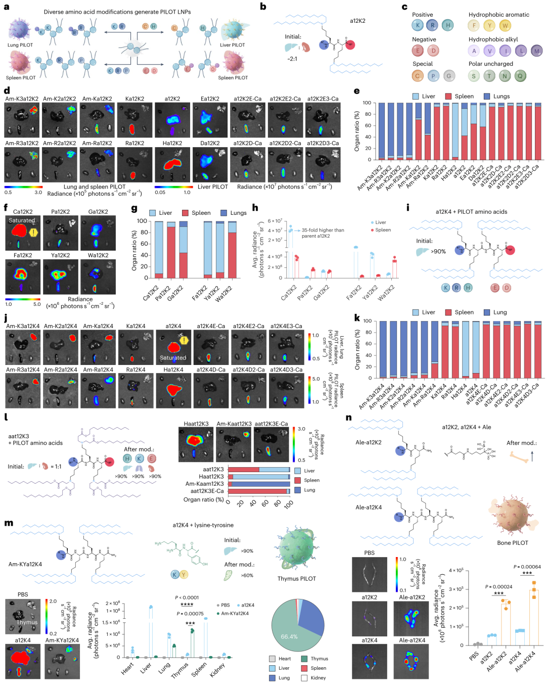 研究还展示了多重氨基酸修饰和功能性分子引入对PILs组织选择性的影响。例如,图4m显示了通过引入赖氨酸-酪氨酸二肽(Am-KYa12K4)显著提高了在胸腺中的mRNA表达,同时减少了在其他组织中的表达。此外,图4n展示了通过引入骨靶向分子Ale(阿仑膦酸钠)显著提高了在股骨和胫骨中的mRNA表达,表明PILOT平台具有广泛的组织靶向潜力。