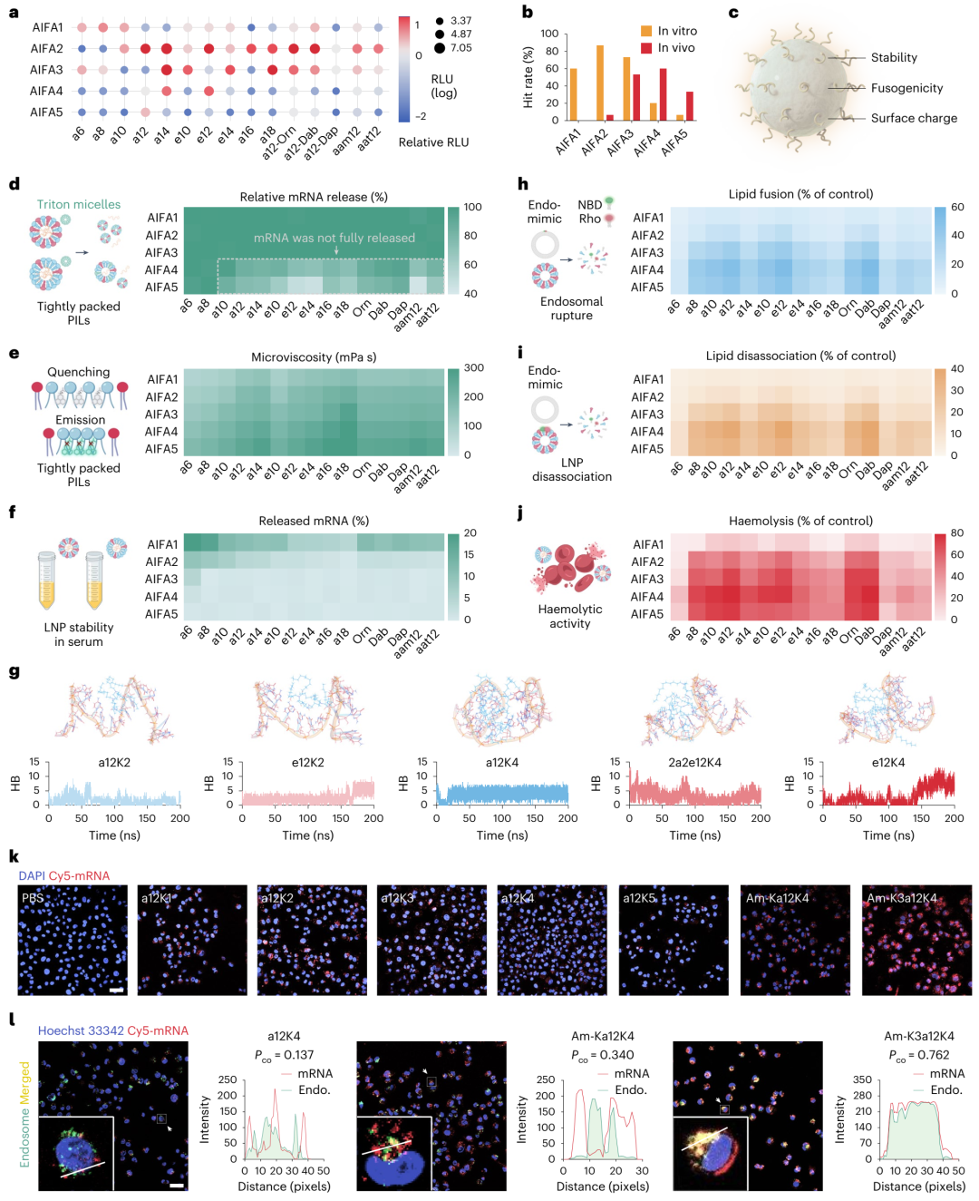 为了进一步优化,研究合成了包含不同侧链长度和类型的赖氨酸类似物(如Orn、Dab和Dap)的PILs。结果显示,Dab-PILs表现出比其他类似物更优的递送效率,其中a12Dab4的Luc表达量比初始领先的a12K4高出1.36倍(图2k)。相比之下,Dap-PILs完全丧失了mRNA递送能力,突显了侧链结构和碱度对PILs设计的重要性(图2k)。
