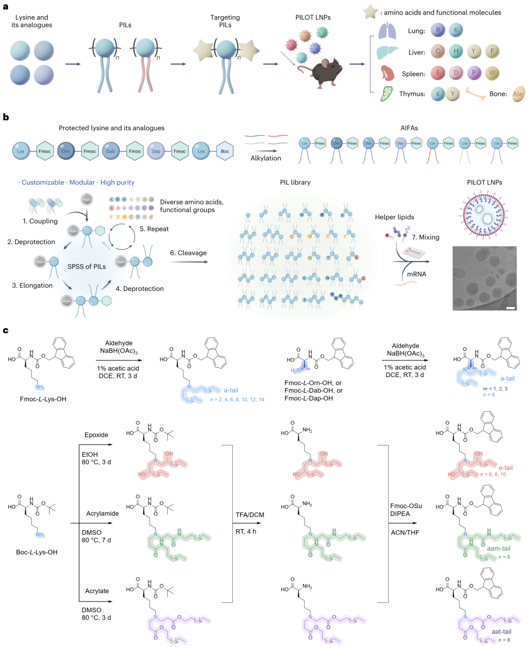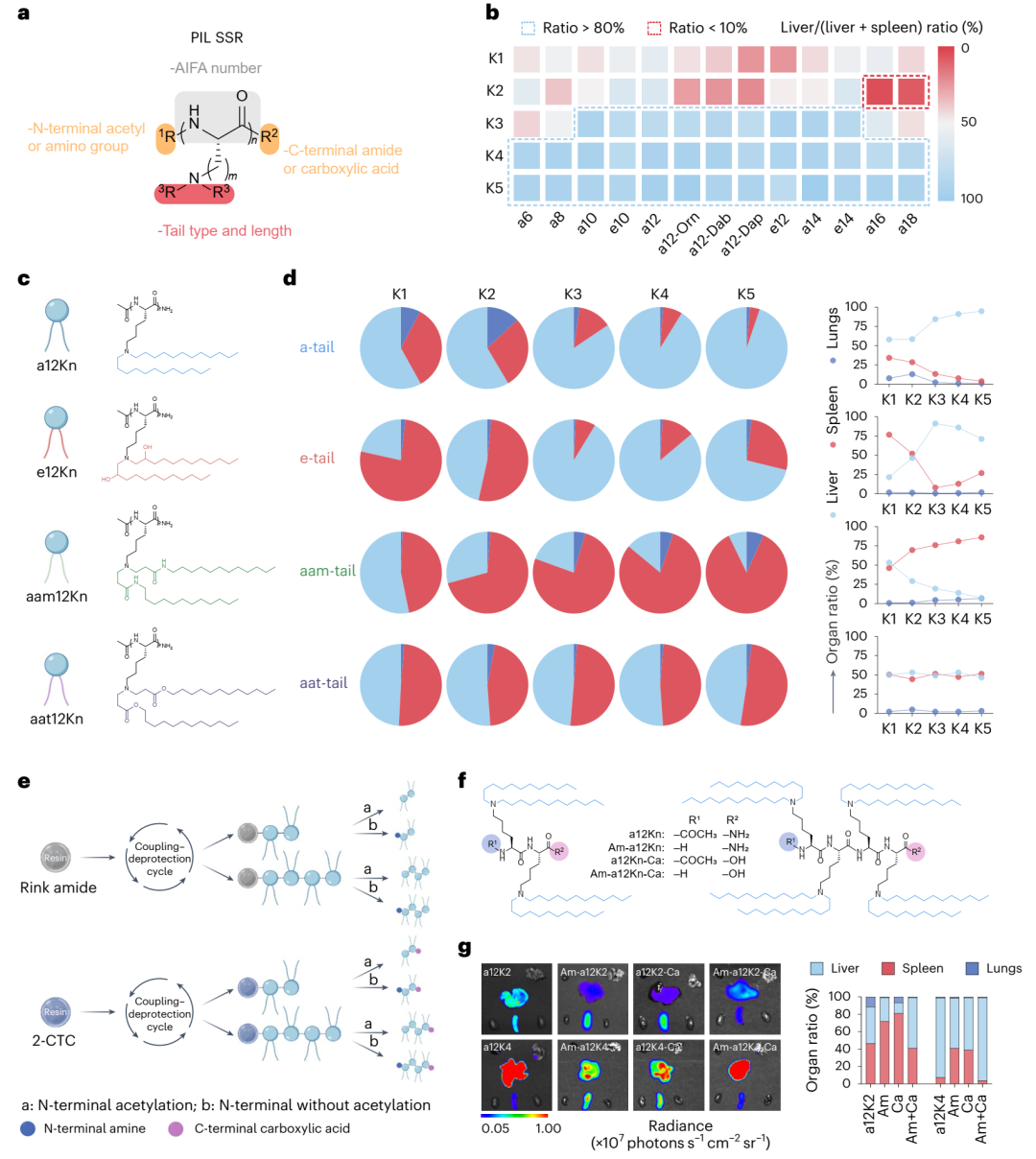 研究成功设计并合成了超过120种结构多样的PILs,这些PILs由天然氨基酸(或其它功能性构建模块)和人工烷基化离子化Fmoc保护氨基酸(AIFAs)通过SPSS方法模块化合成。具体地,通过Fmoc自脱保护反应和标准Fmoc-based SPSS技术,研究合成了包含饱和烷基链(a-tails)、含羟基烷基链(e-tails)、酰胺键(aam-tails)和酯键(aat-tails)的AIFAs。最终,研究获得了75种结构明确的PILs,命名为AnBm,其中“A”代表烷基尾链类型,“n”代表烷基链长度,“B”代表赖氨酸或其类似物,“m”代表AIFAs的数量(图1b)。