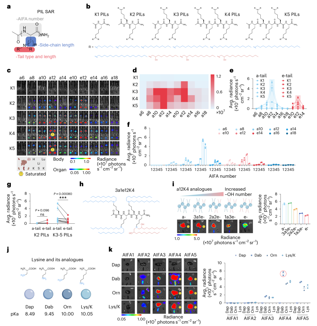 结构-活性关系(SAR),研究首先探索了PILs结构对mRNA-LNP体内递送效率的影响。通过静脉注射LNPs至C57BL/6小鼠,研究发现12碳烷基链长度的PILs表现出最高的递送效率(图2c-e)。进一步分析显示,对于a-tails和e-tails,最优的AIFA数量通常为4(图2f)。值得注意的是,a12K4在所有评估的PILs中脱颖而出,成为领先的候选结构。