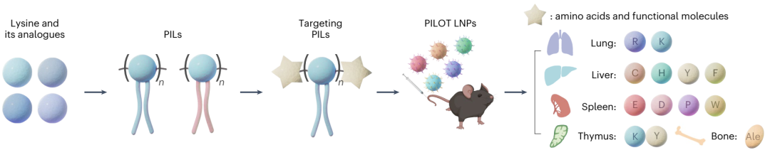 研究展示了PILOT LNPs的构建策略,即通过修饰PILs的特定氨基酸来实现对不同组织的特异性递送。研究选择了a12K2作为母体PIL,通过引入不同功能的氨基酸(如带正电的H、K、R,带负电的E、D,以及特殊氨基酸如C、P、F、Y、W等)来合成一系列PILOT LNPs(图4b, c)。例如,图4d显示了带正电氨基酸修饰的PILs(如Ha12K2, Ka12K2, Ra12K2)在肝脏和脾脏中的特异性递送,其中Ha12K2在肝脏中的特异性最高(94.5%),而Ka12K2和Ra12K2则显著提高了在脾脏中的递送效率(>93.1%)。图4e进一步验证了这些结果,通过流式细胞术分析了不同PILOT LNPs处理后小鼠肝脏、脾脏和肺中的荧光强度,证实了带正电氨基酸修饰的PILs能够显著提高在这些组织中的mRNA表达。