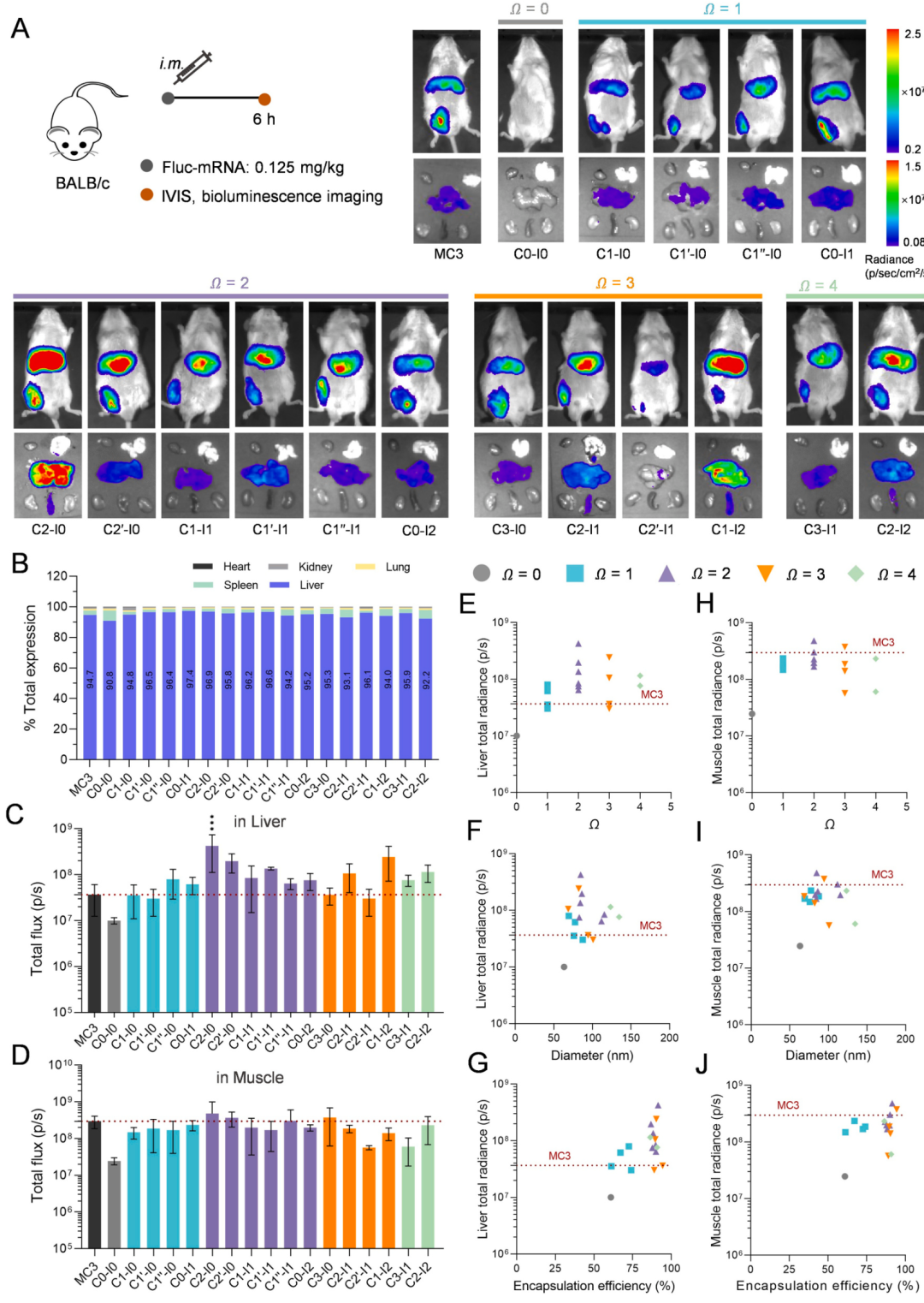 BALB/c小鼠静脉注射Fluc-mRNA负载的LNPs后,生物发光成像显示,所有LNPs均主要靶向肝脏,蛋白表达分布占比86%-97%(图4A, B)。进一步分析表明,尾部不饱和度对肝脏靶向递送效率有显著影响:当Ω=0或1时,多数LNPs的递送效率低于MC3基LNP,但C0-I1例外;当Ω增加至2-4时,7种LNPs(C2-I0、C2'-I0、C1-I1、C1''-I1、C0-I2、C3-I0和C3-I1)的递送效率显著提高,其中C2-I0、C0-I2和C3-I1优于MC3(图4C)。值得注意的是,当Ω=2时,含顺式双键的C1-I1递送效率高于含反式双键的C1'-I1;当Ω>2时,羧酸端疏水尾部(R3)双键数量较多的LNPs(如C3-I0和C3-I1)递送效率更高(图8E)。相关性分析显示,递送效率与R3尾部不饱和度(Ω')呈显著正相关(PCC=0.5770, p=0.0307),但与总Ω值、粒径和Zeta电位无显著相关性(图4D-F)。此外,mRNA包封效率与体内递送效率呈正相关(PCC=0.5037, p=0.0393)(图4G)。