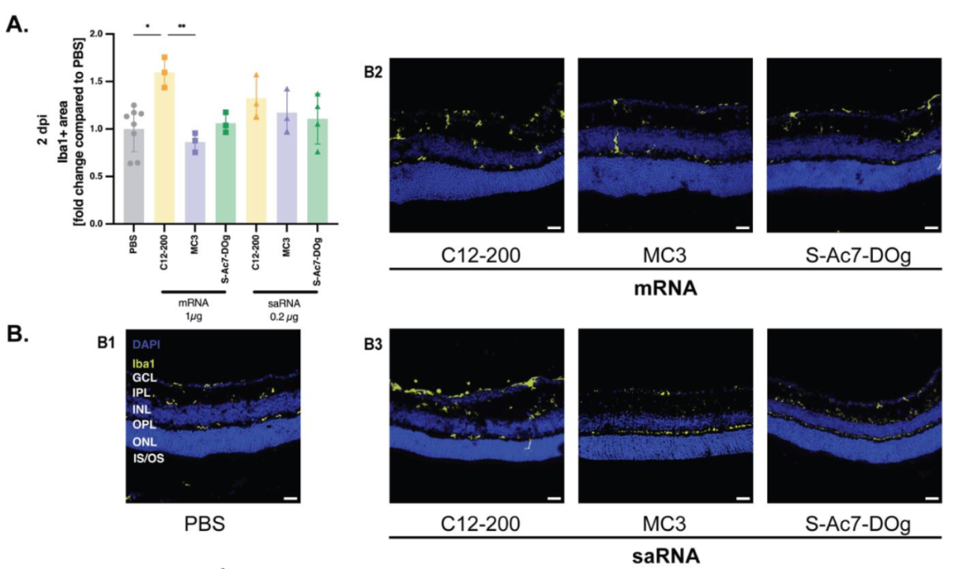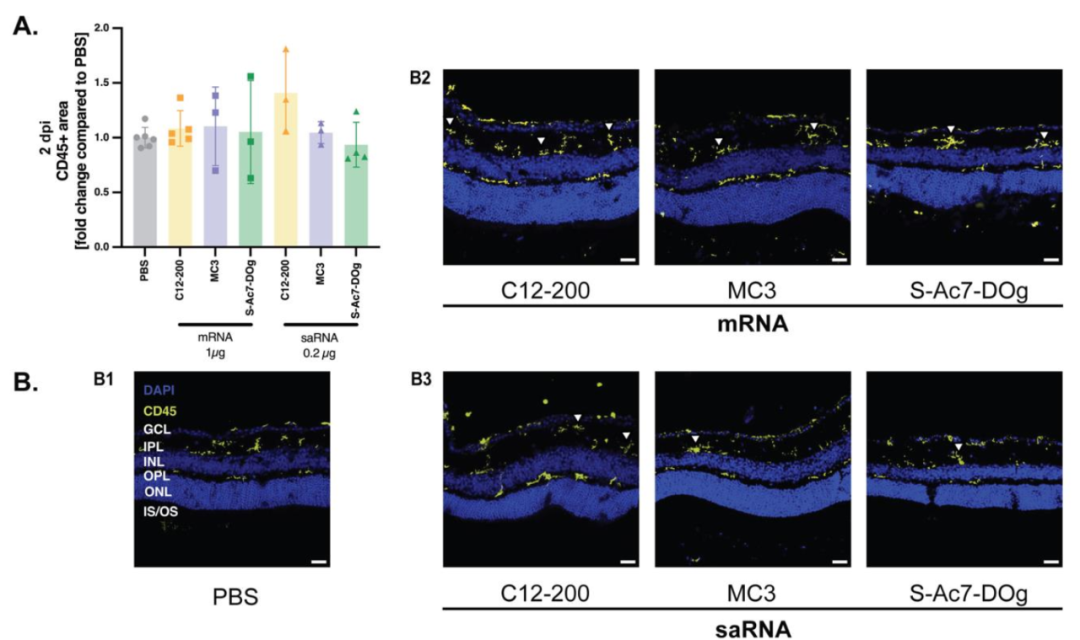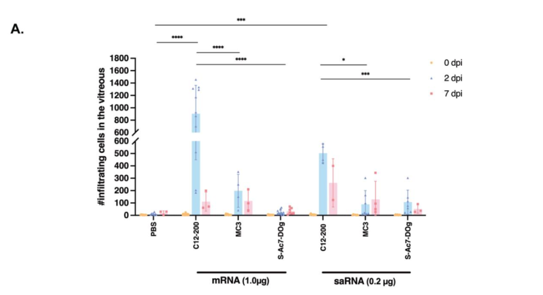 玻璃体腔内白细胞浸润:注射后2天,C12-200 mRNA LNPs引发了最强的免疫反应,玻璃体腔内白细胞浸润显著增加(平均906 ± 457个细胞),而MC3和S-Ac7-DOg mRNA LNPs引发的白细胞浸润较少(图3A)。saRNA LNPs中,C12-200也引发了较强的白细胞浸润(平均503 ± 77个细胞)。注射后7天,所有LNP配方的白细胞浸润均有所减少,表明免疫反应具有暂时性(图3A)。