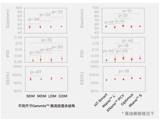 INano™ L/L+快速纳米药物制备系统创新性的解决了纳米药物(如脂质纳米颗粒、脂质体等)早期处方筛选和后续临床放大转化过程中的衔接鸿沟。INano™ L/L+系统可适用各种类型的微流控芯片,包括处方筛选微流控芯片和放大生产微流控芯片等。不同规格微流控芯片制备得到的脂质纳米颗粒或脂质体具有高度一致的理化性质和体内外药效结果,如粒径均控制在50-60 nm,PDI 在0.10以下,LNP包封率保持在90%以上。INano™ L/L+微流控混合设备可以让您使用ml级物料即可确定后续生产工艺,大幅度降低放大的风险和成本!
