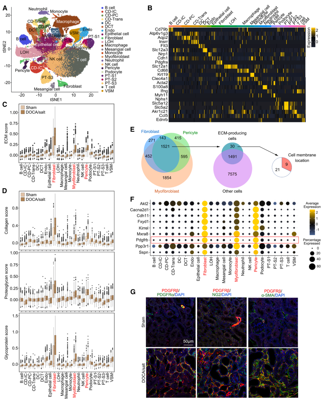 单细胞RNA测序鉴定ECM产生细胞:通过对DOCA/盐诱导的高血压肾病小鼠模型的肾脏进行单细胞RNA测序(scRNA-seq),研究成功鉴定了肾脏中主要的ECM产生细胞类型,包括成纤维细胞、周细胞和肌成纤维细胞。