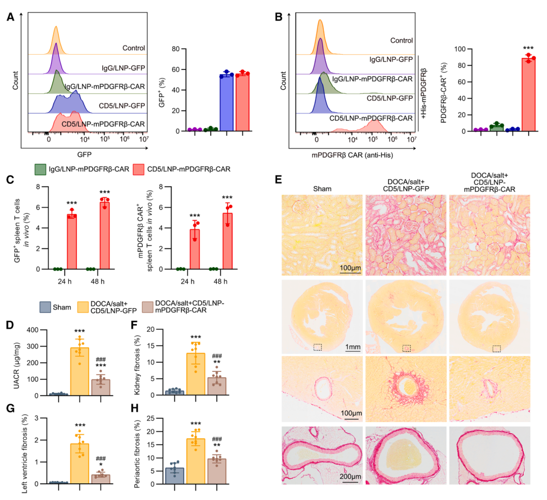 体内CAR-T细胞生成系统的抗纤维化效果在DOCA/盐诱导的高血压肾病模型中,研究通过静脉注射CD5/LNP-PDGFRβ CAR-mRNA生成CAR-T细胞。结果显示,注射后2天,脾脏T细胞中约6%表达GFP和CAR(图4C)。这些体内生成的CAR-T细胞显著减轻了UACR、肾脏、心肌和血管周围纤维化程度(图4D-H)。