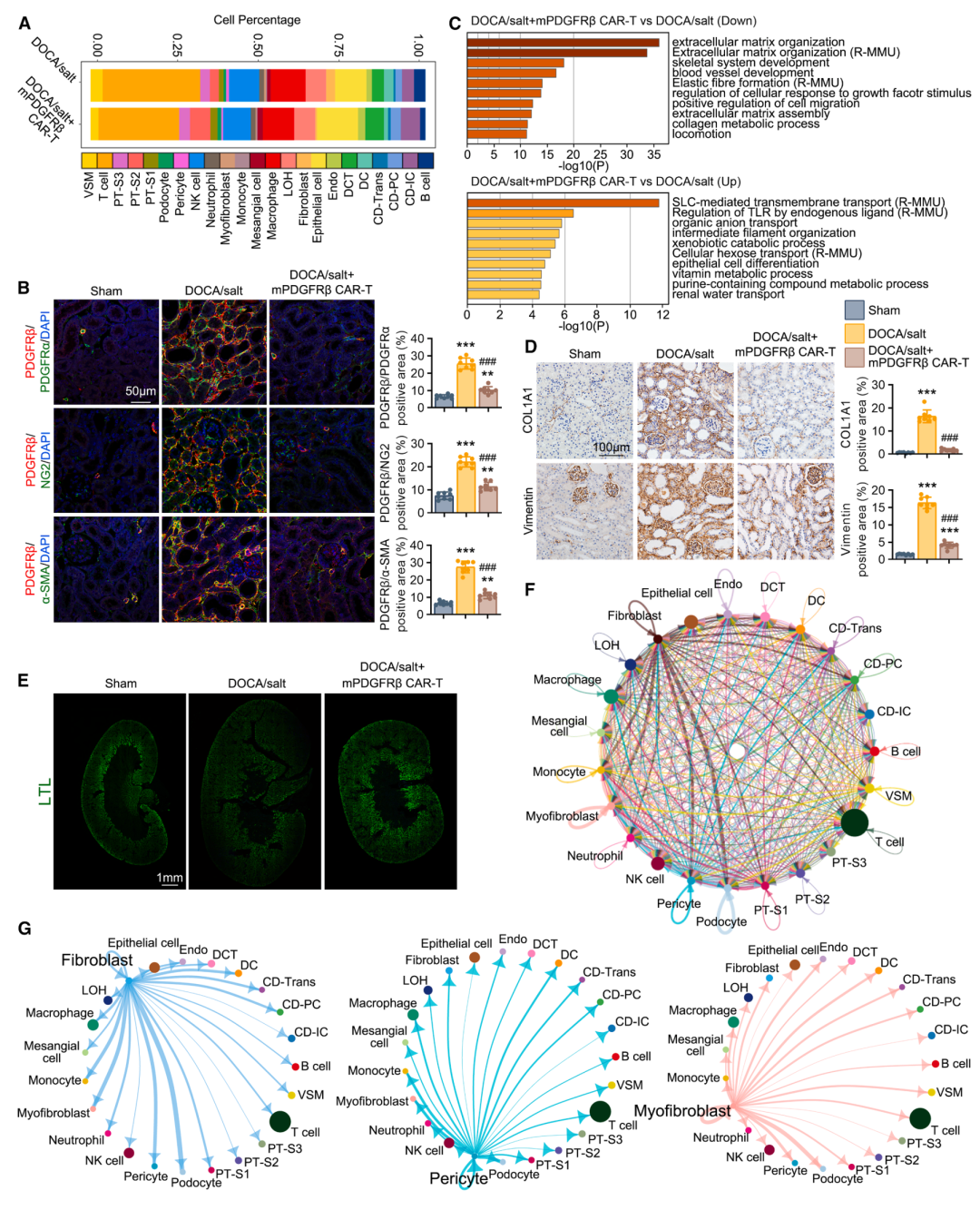 scRNA-seq分析CAR-T细胞治疗后的肾脏细胞组成:为了深入了解PDGFRβ CAR-T疗法改善肾脏损伤的机制,研究对CAR-T细胞治疗后的高血压小鼠肾脏进行了scRNA-seq分析。结果显示,mPDGFRβ CAR-T细胞输注减少了成纤维细胞、周细胞和肌成纤维细胞的比例,同时增加了实质细胞的比例(图3A)。免疫荧光染色进一步证实了肾脏中ECM产生细胞的减少(图3B)。