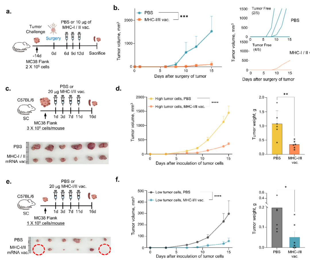为了测试mRNA疫苗在预防肿瘤复发方面的效果,对肿瘤小鼠进行手术切除,并注射PBS或联合递送MHC-I和MHC-II mRNA疫苗(图5a)。与PBS处理组相比,mRNA疫苗处理组肿瘤复发显著减少(图5b)。此外,通过每周一次给予PBS或MHC-I/MHC-II疫苗,持续三周,测试了预防性接种的抗癌效果。与对照组相比,接受mRNA基础新抗原疫苗处理的小鼠肿瘤生长显著减少,无瘤小鼠数量增加。IFN-γ ELISpot分析确认了预防性接种后新抗原特异性IFN-γ分泌,表明产生了强烈的免疫反应。