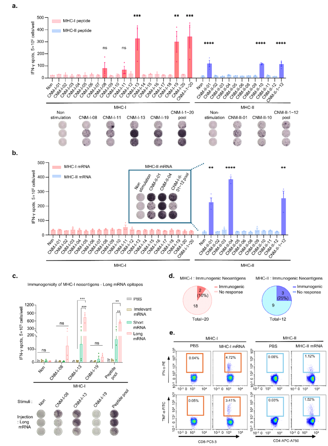 为了评估预测新抗原的免疫原性,将32个具有高MHC-I和MHC-II结合预测评分的新抗原候选序列合成为合成长肽(SLPs)。其中,20个与MHC-I相关的新抗原被合成为8-10个氨基酸的肽,而12个与MHC-II相关的新抗原被合成为27个氨基酸的肽。这些肽与poly I:C混合后,每周一次皮下注射给C57BL/6小鼠。最后一次免疫后一周,收集脾细胞进行IFN-γ ELISpot分析。结果显示,两个MHC-I相关的新抗原(CNM-I-13和CNM-I-19)和两个MHC-II相关的新抗原(CNM-II-01和CNM-II-10)表现出显著的抗原特异性IFN-γ分泌(图2a)。