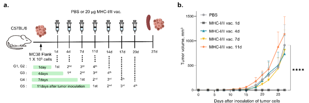 随后,构建了编码相应新抗原的mRNA,并封装在脂质纳米颗粒(LNPs)中。将mRNA疫苗在0、4、7和14天皮下注射给C57BL/6小鼠。编码MHC-II限制性新抗原的mRNA疫苗(CNM-II-01和CNM-II-04)显著增加了IFN-γ分泌,而编码MHC-I相关新抗原的mRNA疫苗在治疗期间未诱导IFN-γ分泌(图2b)。进一步构建了编码长序列(27个氨基酸)MHC-I相关新抗原的mRNA疫苗,发现其比短序列(8-10个氨基酸)mRNA疫苗更具免疫原性(图2c)。总体而言,通过计算机模拟方法预测的新抗原中,10%的MHC-I抗原和25%的MHC-II抗原表现出免疫原性(图2d)。