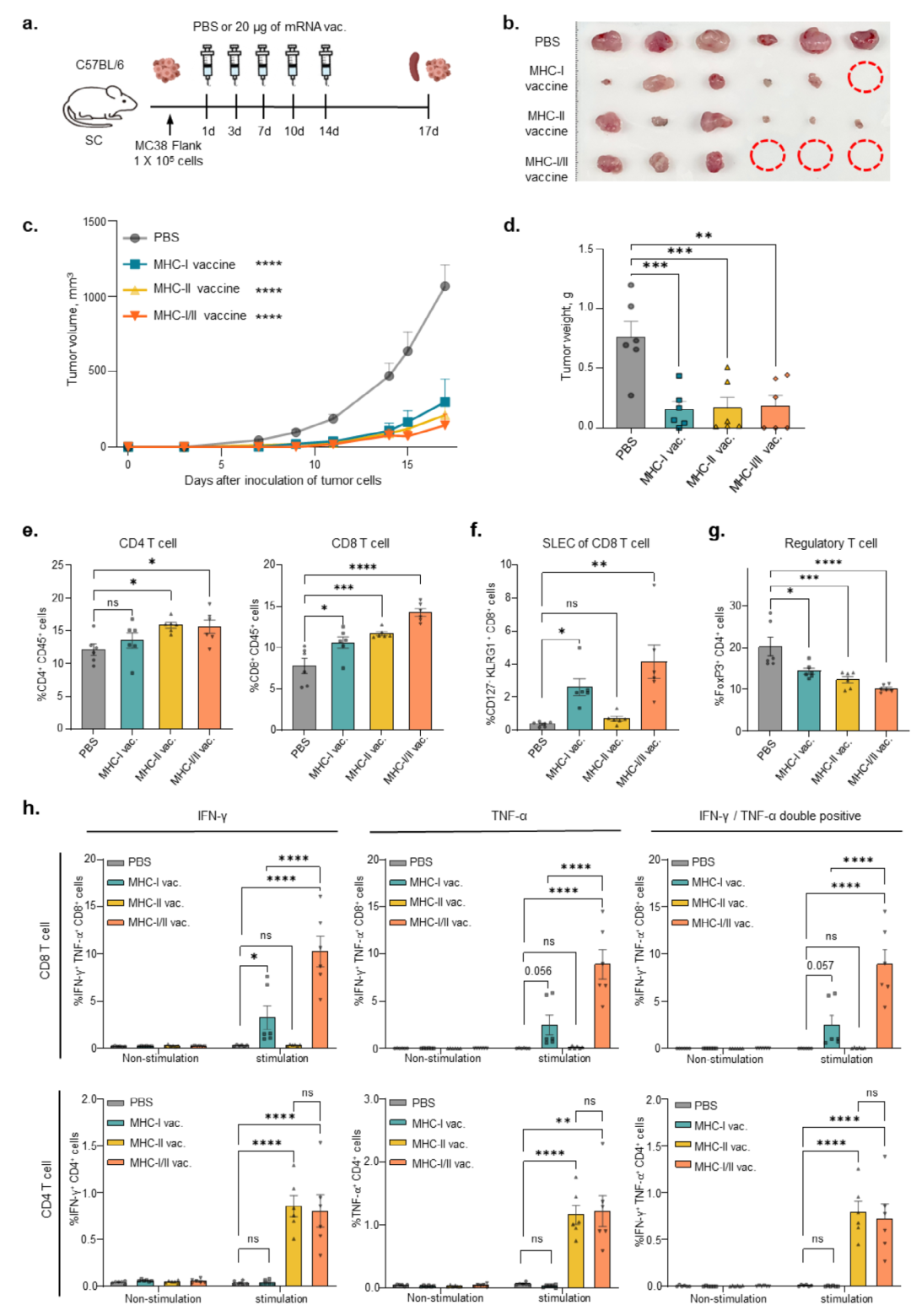 在MC38肿瘤小鼠模型中,分别给予MHC-I疫苗、MHC-II疫苗或两者联合疫苗,评估mRNA疫苗的抗癌效果(图4a)。与磷酸盐缓冲液(PBS)处理组相比,mRNA疫苗处理组显著抑制了结肠肿瘤的生长和体积(图4b-d)。联合递送MHC-I和MHC-II疫苗组无瘤小鼠数量显著增加(3/6),高于单独给予MHC-I(1/6)或MHC-II疫苗(0/6)组。此外,流式细胞术数据显示,MHC-II疫苗处理组CD4+/CD8+T细胞数量显著增加(图4e)。联合递送MHC-I和MHC-II疫苗比单独给予MHC-I疫苗诱导了更多的CD8+短寿命效应T细胞(SLECs,CD127-KLRG1+的CD8+细胞)增殖(图4f)。所有疫苗处理组的调节性T细胞(Treg)增殖均显著减少(图4g)。