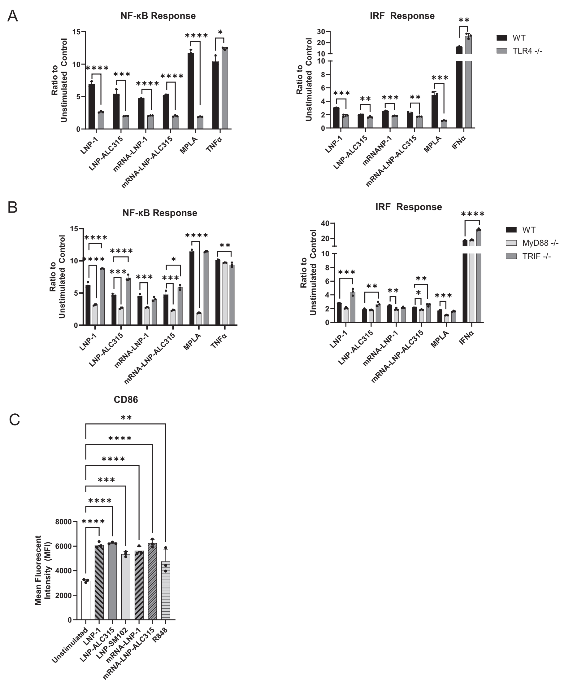 Fig. 4 | LNP-mediated NF-ĸB and IRF signaling transduction dependence on TLR4 and adaptor molecules.