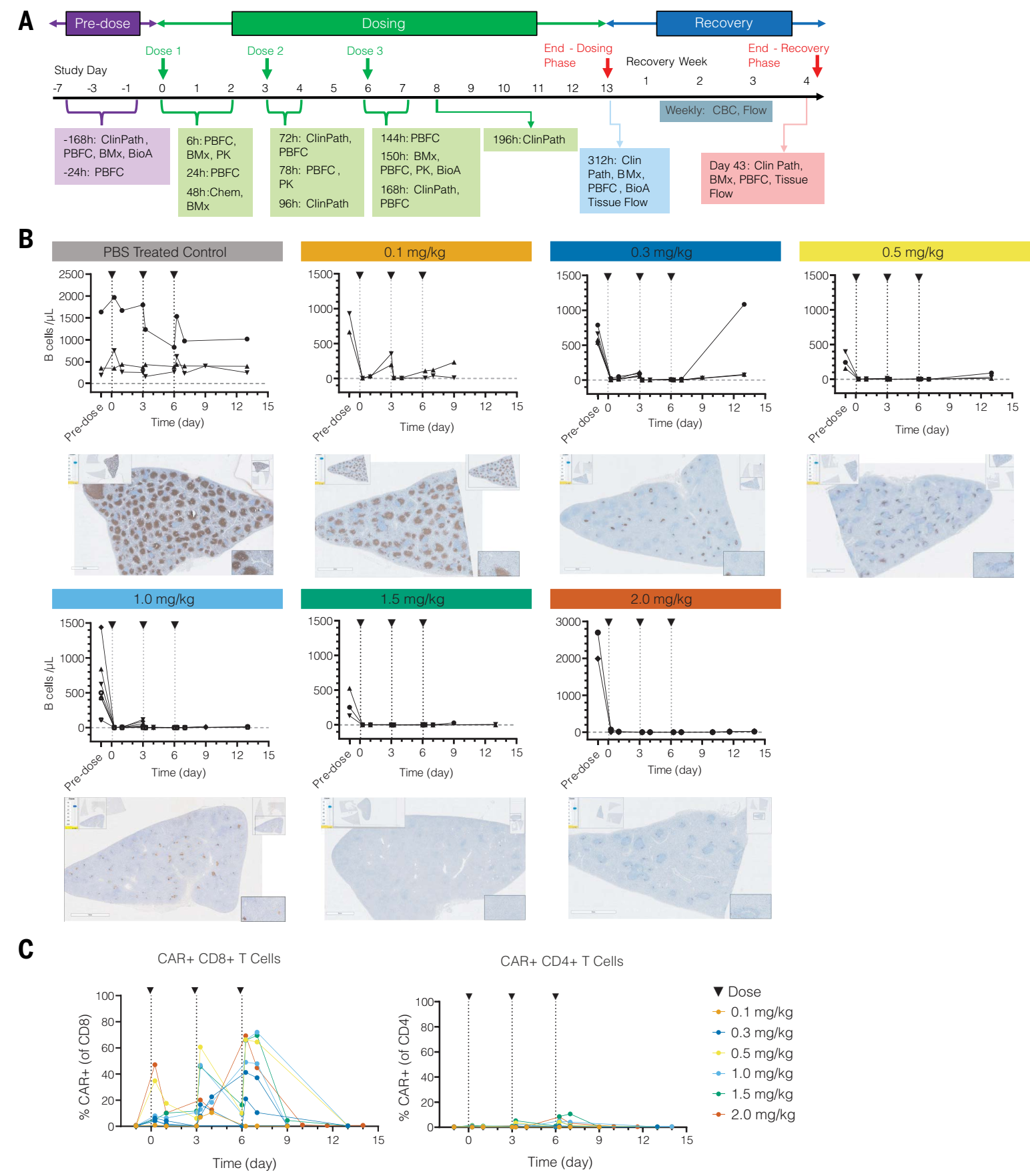 Fig. 4. Treatment with tLNPs encapsulating B cell–targeted CAR mRNA induces deep B cell depletion in cynomolgus monkeys.