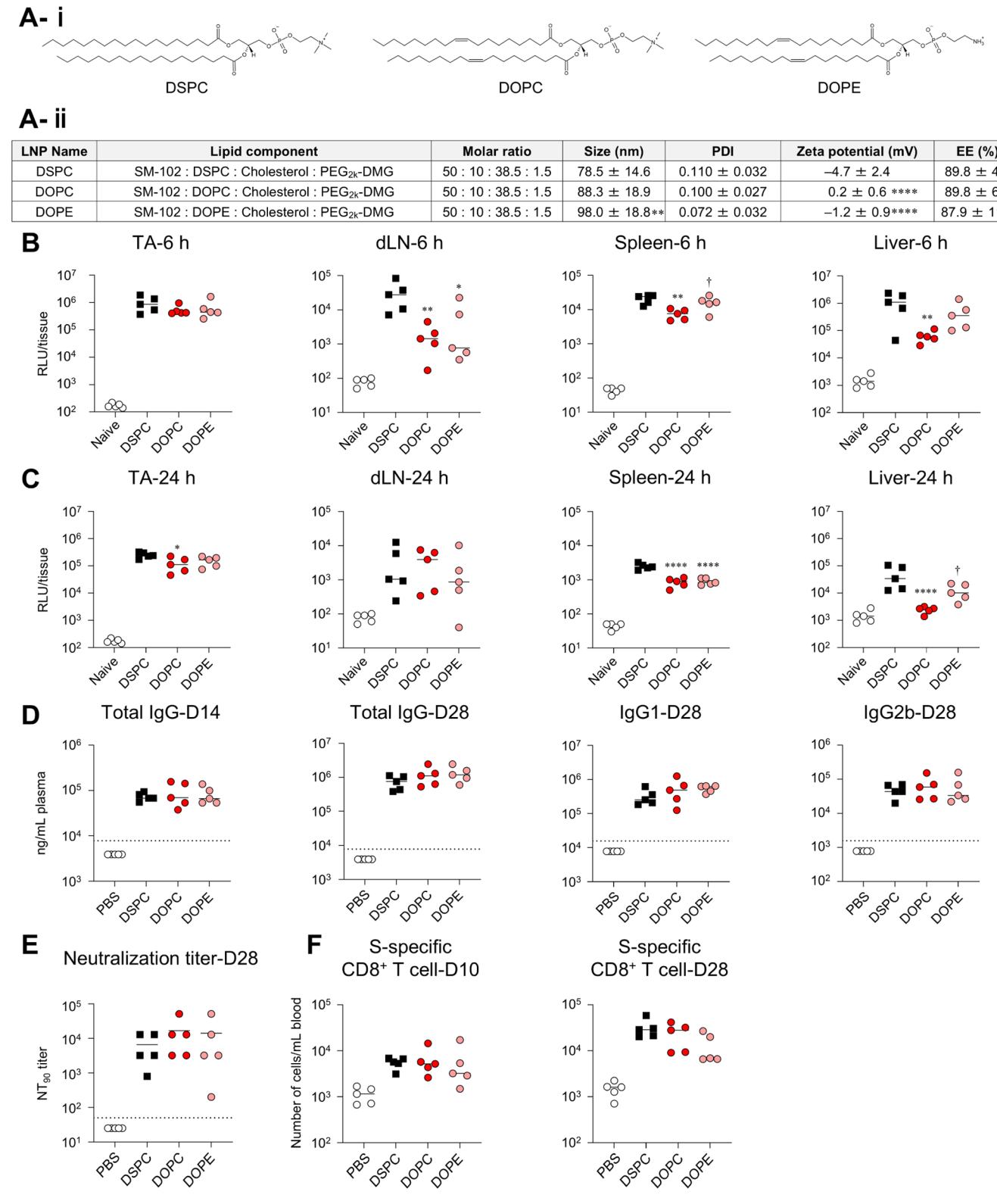Figure 8. Effect of replacement of phospholipid on in vivo protein expression and immune responses induced by mRNA-LNPs. (A-i) Chemical structures of DSPC, DOPC, and DOPE.