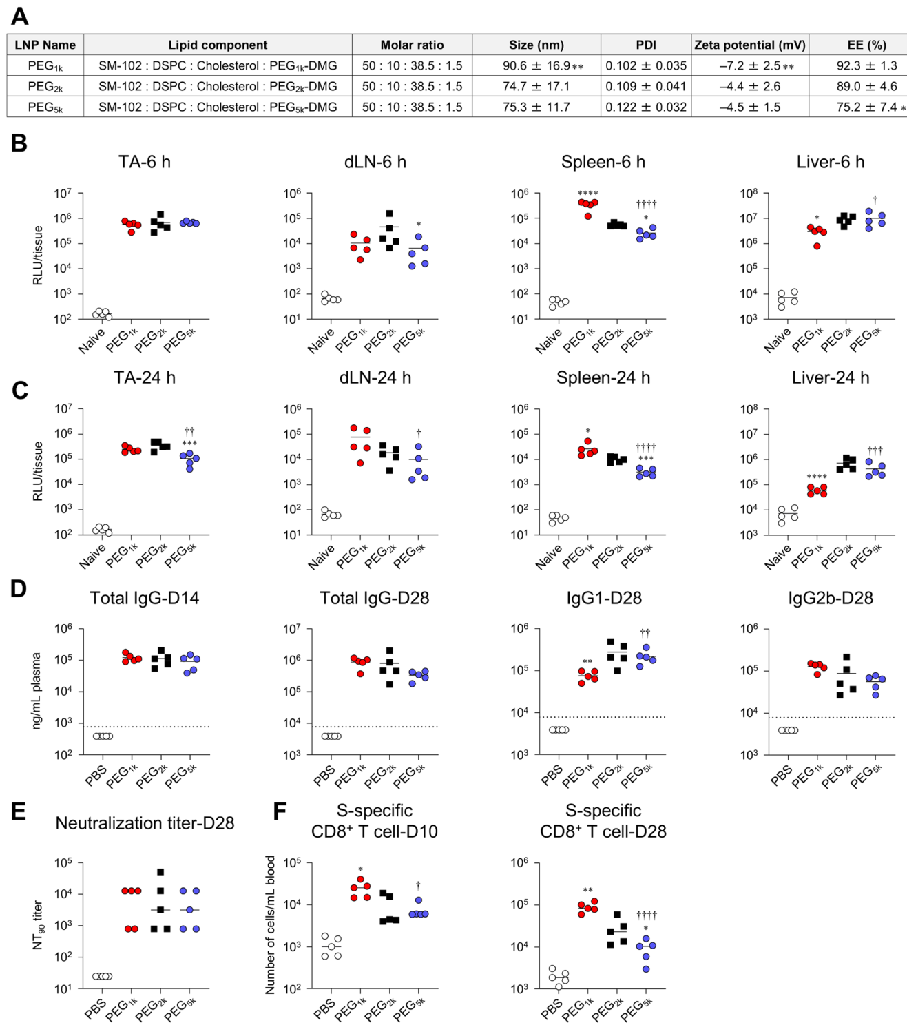 研究评估了不同链长PEG脂质(PEG1k-DMG、PEG2k-DMG、PEG5k-DMG)对mRNA-LNP疫苗在体内蛋白表达的影响。实验结果显示,在注射后6小时和24小时,不同链长PEG脂质修饰的LNP在胫骨前肌(TA)、引流淋巴结(dLN)、脾脏和肝脏中的荧光素酶(FLuc)活性无显著差异。这表明PEG链长的变化在短期内对mRNA在体内的表达位置和水平影响不大(图2B, C)。