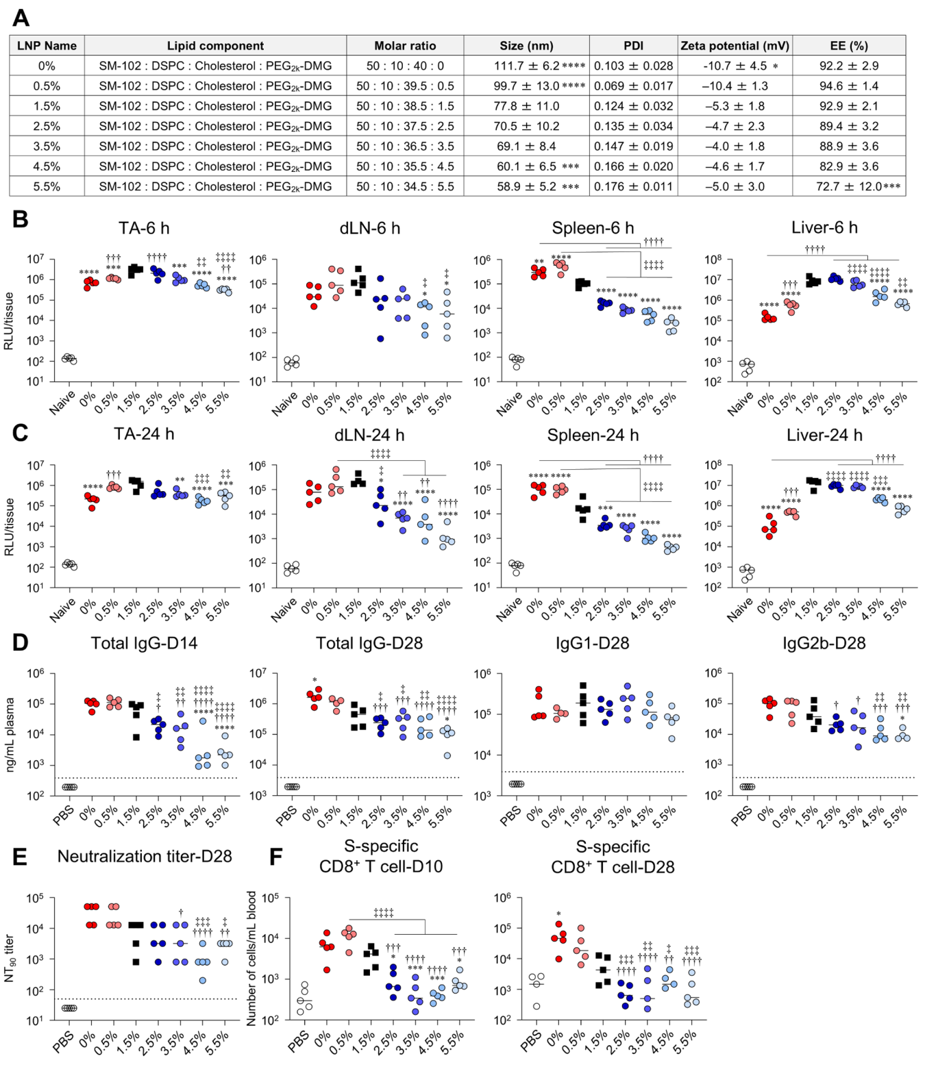 研究还评估了不同PEG脂质摩尔比(0%、0.5%、1.5%)对mRNA-LNP疫苗体内蛋白表达的影响。实验结果显示,在注射后6小时和24小时,不同PEG脂质摩尔比的LNP在各组织中的FLuc活性无显著差异(图4B, C)。这表明PEG脂质摩尔比的变化在短期内对mRNA体内表达的影响较小。
