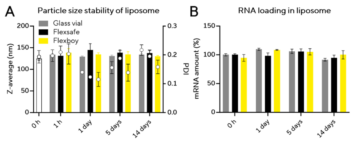 除了LNPs外,研究还评估了mRNA负载的脂质体在SU袋中的短期稳定性。实验结果显示,当脂质体在4°C条件下储存在Flexsafe和Flexboy袋中两周后,其粒子大小和mRNA浓度均保持稳定(图3)。具体而言,粒子大小在储存前后未发生显著变化,表明脂质体在低温条件下具有良好的短期物理稳定性。同时,RiboGreen检测显示,脂质体的mRNA封装效率高于95%,进一步验证了脂质体在短期储存过程中对mRNA的有效封装。