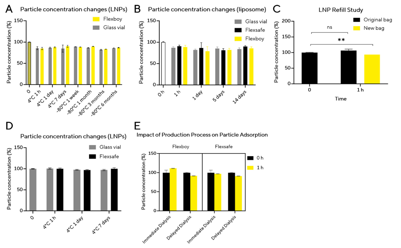 实验结果显示,当将储存后的LNPs重新转移到新的Flexboy袋中时,粒子浓度在第一小时内进一步下降了7%;而转移到原始袋中的LNPs粒子浓度则保持稳定(图5C)。这一结果表明,粒子浓度的下降可能是由于粒子吸附到储存容器上,而非材料损失。此外,研究还发现,使用双通道注射泵快速制备的LNPs在储存在Flexsafe袋和玻璃小瓶中时,未出现粒子浓度下降的现象(图5D)。这表明,LNP制备过程的稳定性和结构完整性对减少粒子吸附至关重要。