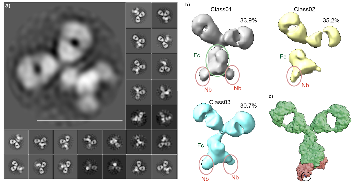 Figure 2. a) TEM obtained for a, 2D projection of nanobody:antibody complexes. b) 3D models showing the nanobody binding to the Fc domain. c) 3D reconstruction of 2D projection. The Gln15 residue (highlighted in Blue and circled in black) was identified as a point of attachment to the LNP.