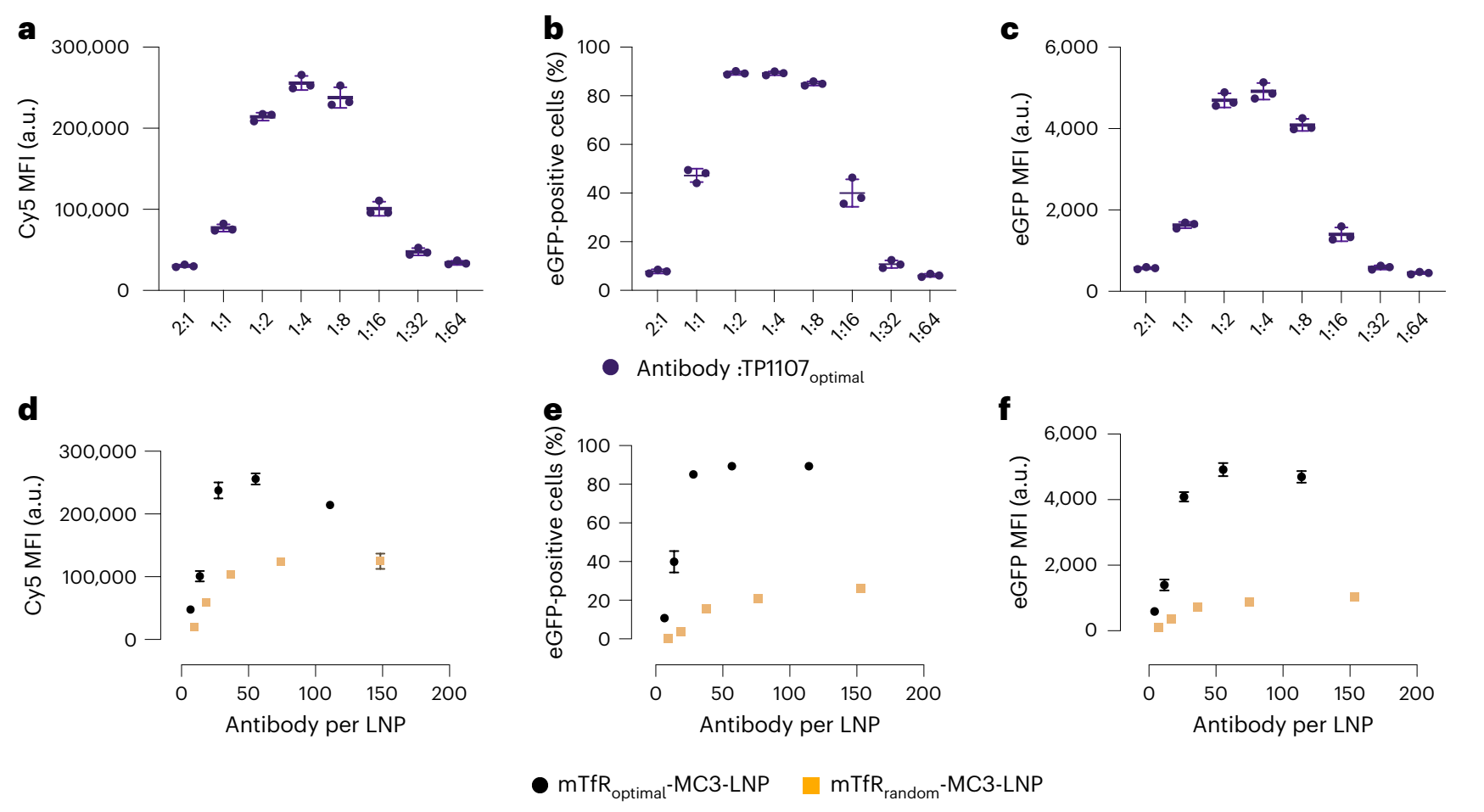 通过调整抗体与TP1107的比例,我们发现当抗体与TP1107的比例为1:8至1:2时,细胞结合和eGFP表达达到最佳效果(图4a-c)。进一步比较TP1107optimal和TP1107random修饰的LNP,我们发现TP1107optimal修饰的LNP在相同抗体数量下显示出更高的细胞结合和eGFP表达(图4d-f)。这表明,优化纳米抗体在LNP表面的定向捕获对于提高靶向递送效率至关重要。