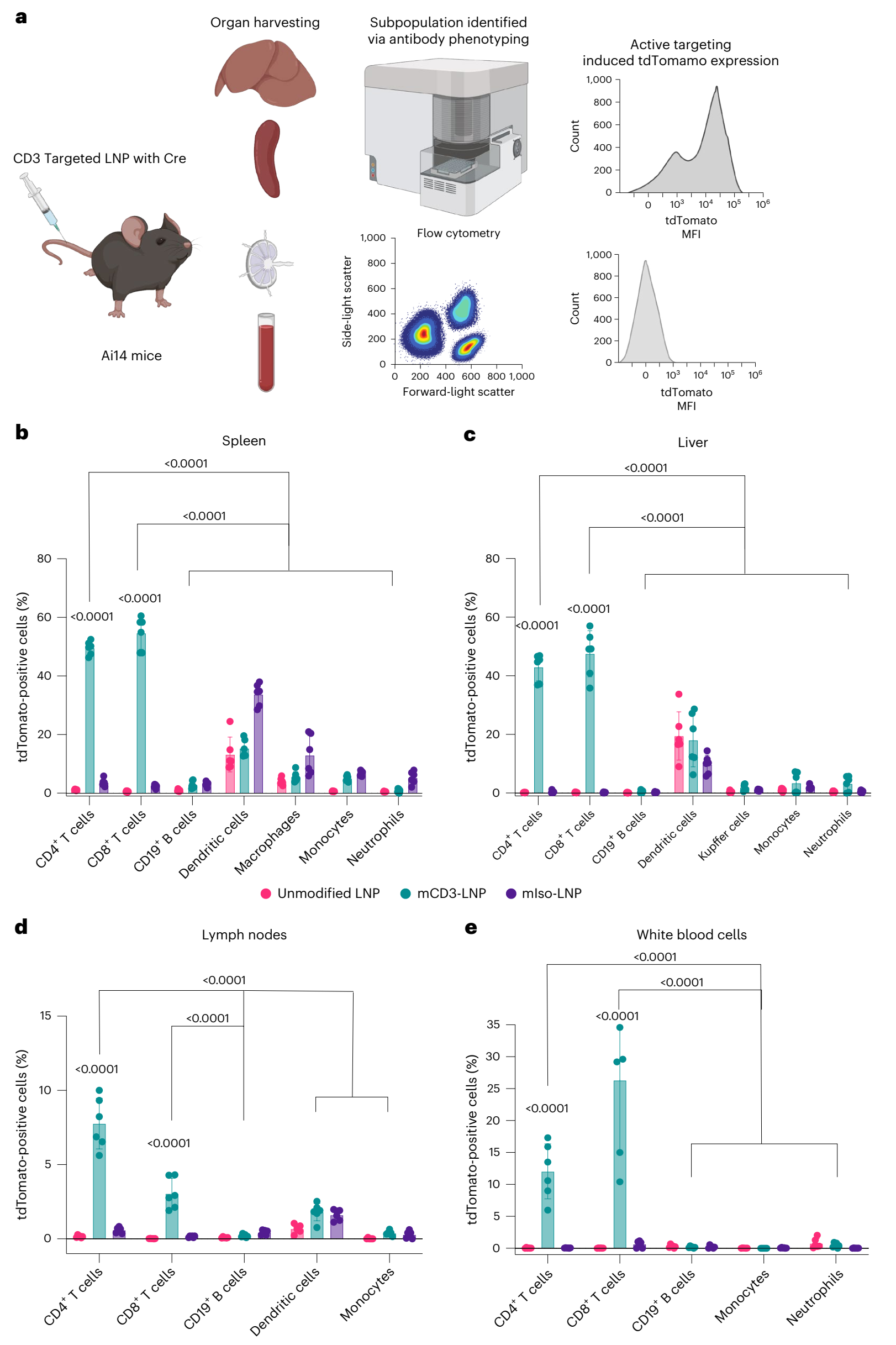 为了评估功能化LNP在体内的靶向递送效率,我们使用了Ai14报告基因小鼠模型。通过静脉注射给予小鼠含有Cre mRNA的功能化LNP(mCD3-LNP),24小时后收集脾脏、肝脏、淋巴结和血液样本进行分析。实验结果显示,mCD3-LNP在脾脏、肝脏、淋巴结和血液中的T细胞亚群中诱导了显著的tdTomato表达(图6b-e)。具体而言,在脾脏中,约50%的CD4+ T细胞和54%的CD8+ T细胞表现为tdTomato阳性;在肝脏中,相应比例分别为43%和47.5%。此外,我们还观察到mCD3-LNP在B细胞和其他免疫细胞中的脱靶递送极低(图6b-e)。这些结果证实了功能化LNP在体内的高效靶向递送能力,且最小化了对非靶细胞的脱靶效应。