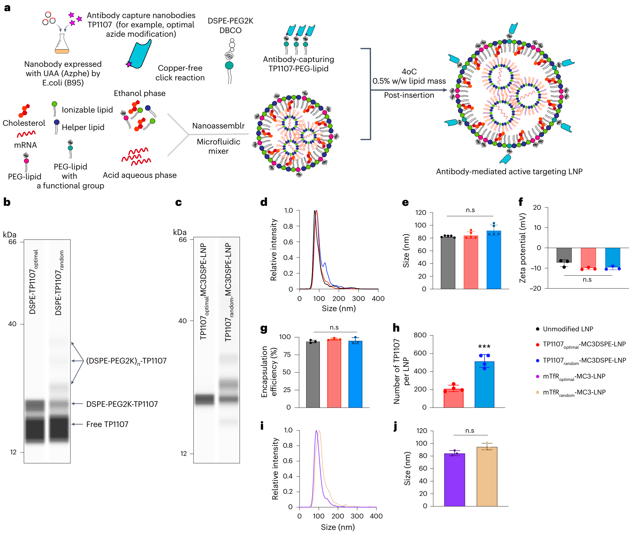 进一步实验表明,优化后的TP1107(TP1107optimal)在LNP表面的结合效率显著高于随机结合的TP1107(TP1107random)。具体而言,TP1107optimal修饰的LNP在蛋白质印迹分析中显示出单一清晰的条带,对应于单个DSPE-PEG2000-DBCO脂质修饰的纳米抗体,而TP1107random则显示出多个条带,表明存在多个脂质修饰的纳米抗体(图3b, c)。此外,NTA分析显示,TP1107optimal-MC3/DSPE LNP的平均粒径为85 nm,与未修饰的LNP相似,且没有观察到明显的粒子聚集(图3d, e)。这些结果证实了TP1107optimal在LNP表面的有效且定向的结合。