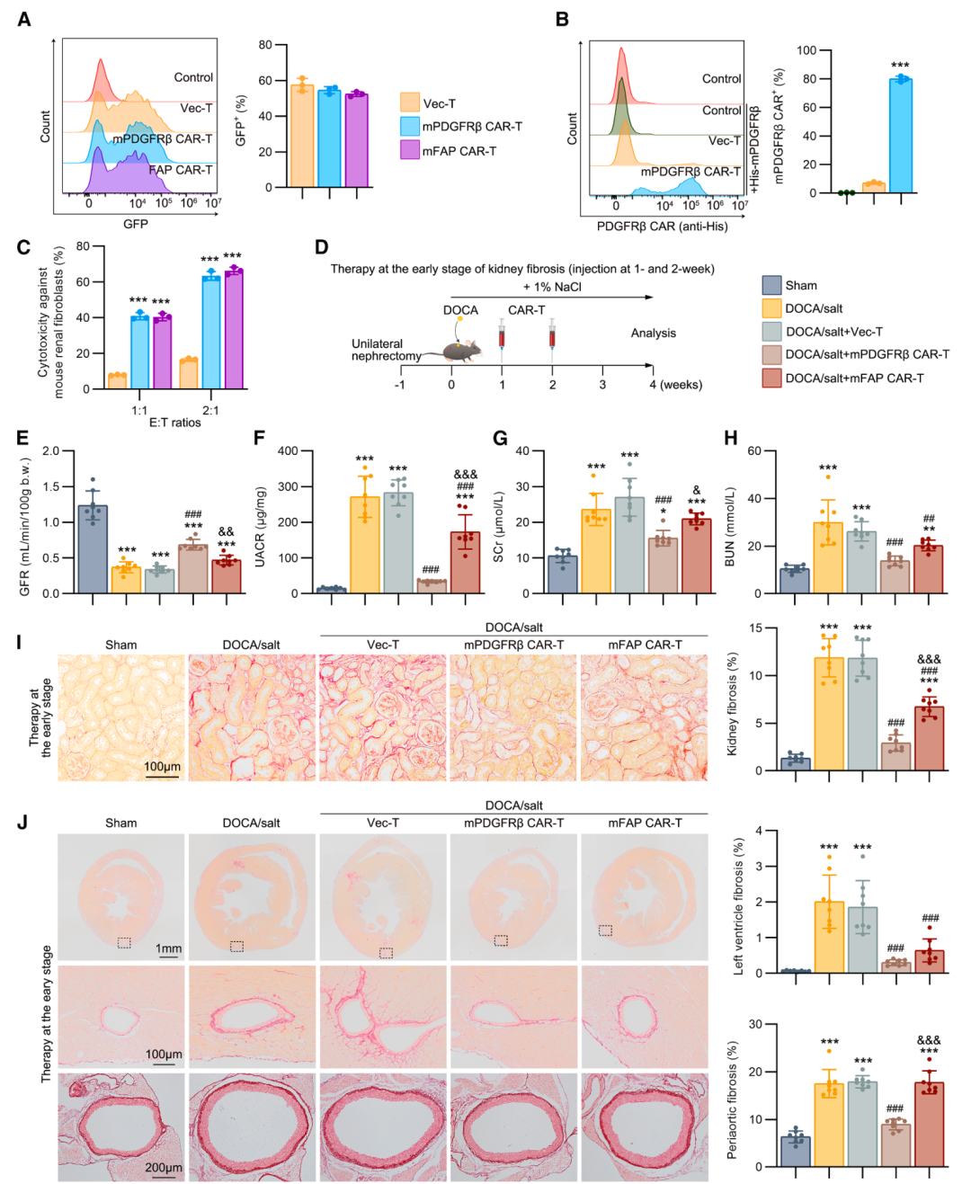 体内CAR-T细胞生成系统的抗纤维化效果在DOCA/盐诱导的高血压肾病模型中,研究通过静脉注射CD5/LNP-PDGFRβ CAR-mRNA生成CAR-T细胞。结果显示,注射后2天,脾脏T细胞中约6%表达GFP和CAR(图4C)。这些体内生成的CAR-T细胞显著减轻了UACR、肾脏、心肌和血管周围纤维化程度(图4D-H)。