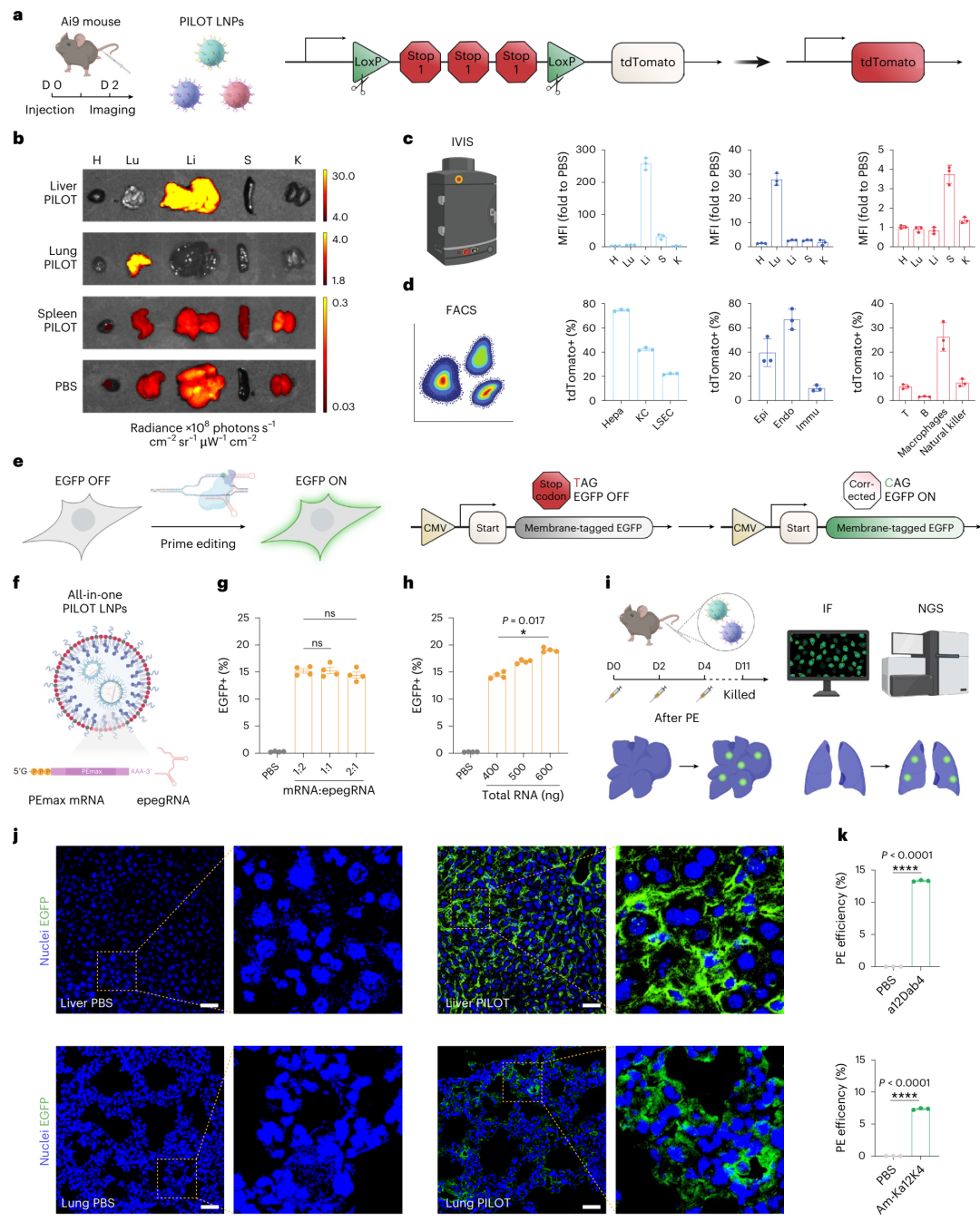 通过共递送PEmax mRNA和epegRNA,研究首次实现了对肝脏和肺组织的特异性Prime编辑。利用HEK293T PE报告细胞系筛选出高效的epegRNA(图6e),研究制备了包含PEmax mRNA和epegRNA的all-in-one LNPs,并在体外验证了其编辑效率(图6g-h)。进一步,通过静脉注射PILOT LNPs至EGFP报告小鼠,研究在肝脏和肺组织中观察到了显著的EGFP阳性细胞(图6j和补充图90)。NGS分析显示,肝脏中的T-to-C点校正效率为13.3%,肺中为7.4%(图6k)。