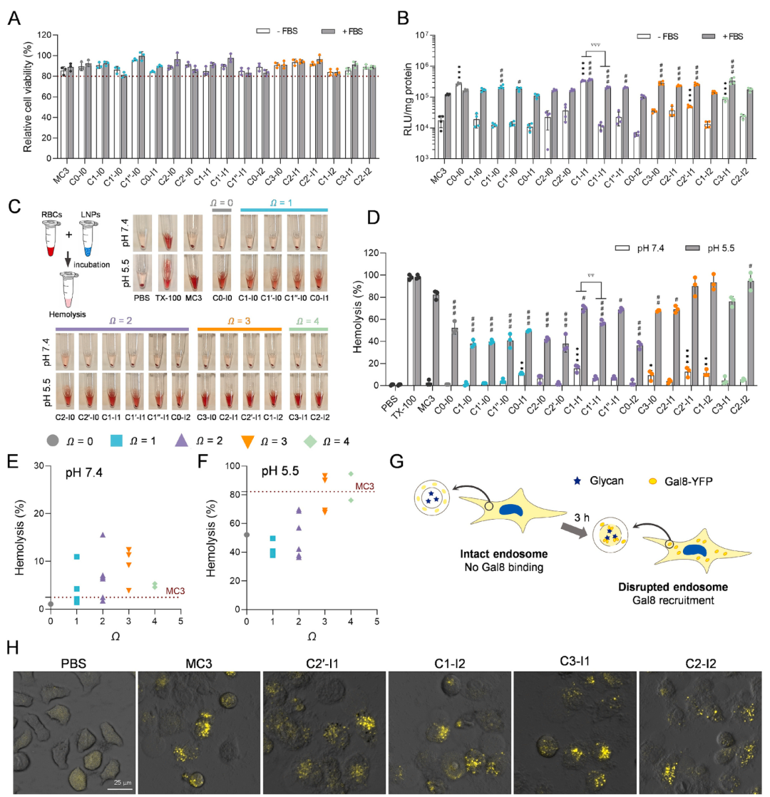 内体逃逸能力通过溶血实验和Gal8-YFP招募实验进行评估。溶血实验显示,在pH 5.5条件下(模拟内体环境),所有LNPs的溶血率均显著高于pH 7.4条件(生理pH),且溶血率与Ω值在pH 5.5时呈正相关(PCC=0.7459, p=0.0006)(图3F)。特别是C2'-I1、C1-I2、C3-I1和C2-I2等LNPs的溶血率与MC3基LNP相当,表明其具有较强的内体膜破坏能力(图3D)。Gal8-YFP招募实验直观展示了LNPs的内体逃逸过程,共聚焦显微镜观察发现,经LNPs处理3小时后,Gal8-YFP-HeLa细胞内出现明显的黄色荧光斑点,表明内体膜被破坏(图3H)。