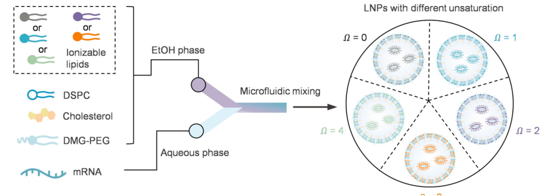 mRNA疗法在疫苗开发、蛋白质替代治疗及基因编辑等领域展现出巨大潜力,但其临床应用仍面临两大挑战:一是mRNA分子难以穿透细胞膜且易被核酸酶降解;二是现有递送系统普遍存在内体逃逸效率低(仅约2%)与免疫原性调控困难的问题。脂质纳米颗粒(LNPs)作为主流递送平台,其核心组分可电离脂质的结构优化对提升递送效能至关重要。然而,传统研究多聚焦于可电离脂质的胺头基和连接区,对疏水尾部不饱和度的作用机制缺乏系统探讨。