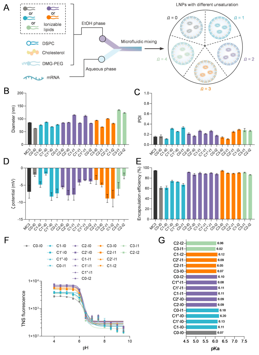 本研究成功合成了17种具有不同尾部不饱和度的可电离脂质,通过四组分Ugi反应(Ugi-4CR)系统实现了对脂质尾部双键数量、类型和位置的精确调控。动态光散射(DLS)结果显示,LNPs的粒径受尾部不饱和度显著影响:当双键总数(Ω)为0时(如C0-I0),LNP粒径约为60 nm,显著小于MC3基LNP(约85 nm);随着Ω增加至1-3,粒径与MC3基LNP相近(80-100 nm);当Ω达到4时(如C3-I1和C2-I2),粒径增大至120-130 nm(图2B)。所有LNPs的PDI均低于0.3,表明粒径分布均匀(图2C)。Zeta电位测量显示,LNPs表面带弱负电荷(图2D)。mRNA包封效率分析表明,Ω=0和1的LNPs包封率较低(60-70%),而Ω≥2的LNPs包封率显著提高至85-95%(图2E)。此外,所有LNPs在4°C储存条件下均表现出高胶体稳定性,仅C0-I0在储存后粒径略有增加。在模拟生理条件(10% FBS, 37°C)下,所有LNPs在24小时内粒径均有所增加,但未出现显著聚集。