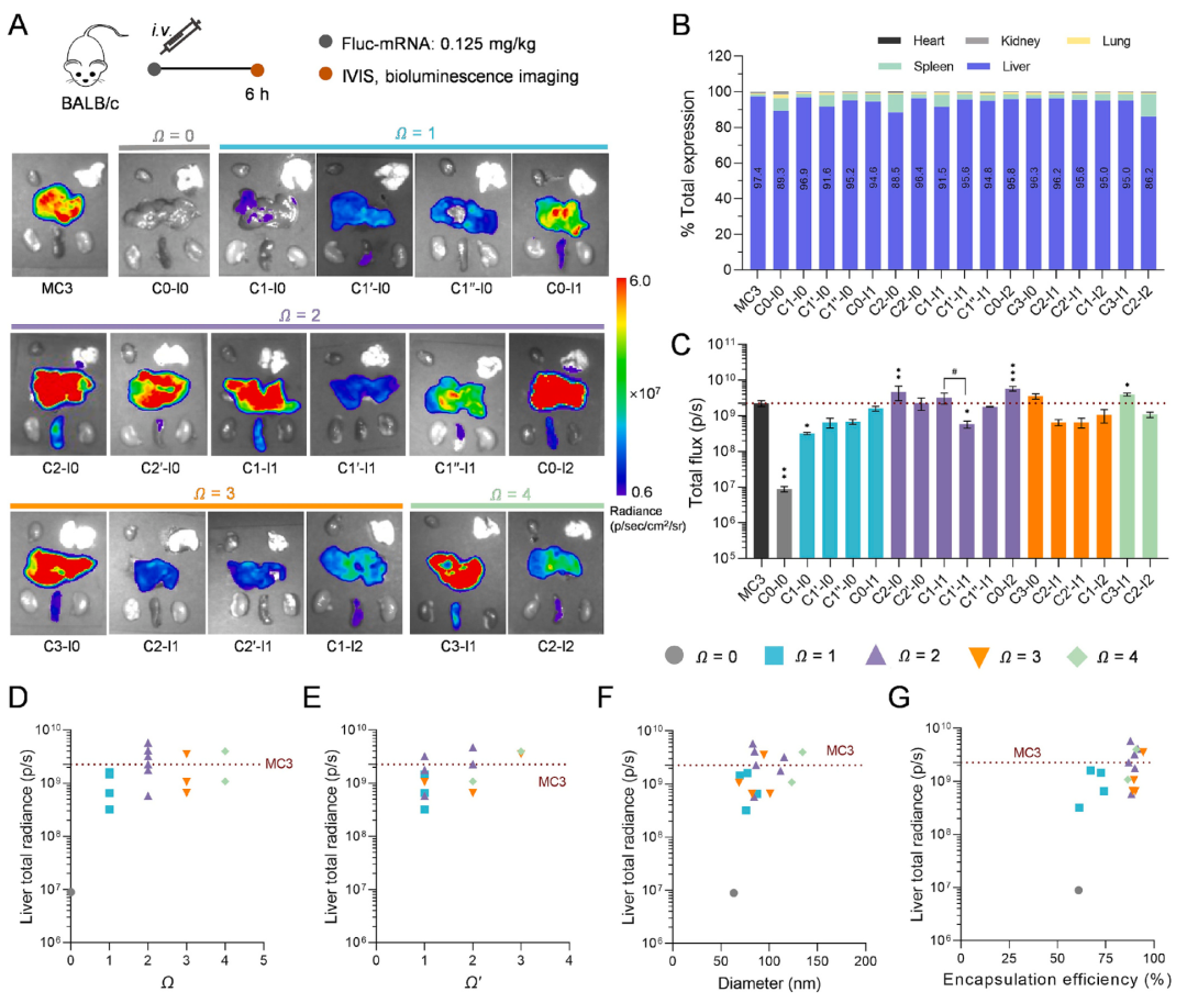 BALB/c小鼠静脉注射Fluc-mRNA负载的LNPs后,生物发光成像显示,所有LNPs均主要靶向肝脏,蛋白表达分布占比86%-97%(图4A, B)。进一步分析表明,尾部不饱和度对肝脏靶向递送效率有显著影响:当Ω=0或1时,多数LNPs的递送效率低于MC3基LNP,但C0-I1例外;当Ω增加至2-4时,7种LNPs(C2-I0、C2'-I0、C1-I1、C1''-I1、C0-I2、C3-I0和C3-I1)的递送效率显著提高,其中C2-I0、C0-I2和C3-I1优于MC3(图4C)。值得注意的是,当Ω=2时,含顺式双键的C1-I1递送效率高于含反式双键的C1'-I1;当Ω>2时,羧酸端疏水尾部(R3)双键数量较多的LNPs(如C3-I0和C3-I1)递送效率更高(图8E)。相关性分析显示,递送效率与R3尾部不饱和度(Ω')呈显著正相关(PCC=0.5770, p=0.0307),但与总Ω值、粒径和Zeta电位无显著相关性(图4D-F)。此外,mRNA包封效率与体内递送效率呈正相关(PCC=0.5037, p=0.0393)(图4G)。