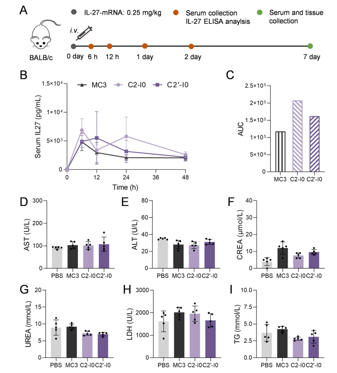 以IL-27 mRNA为模型,评估C2-I0和C2'-I0在蛋白质补充治疗中的潜力。静脉注射0.25 mg/kg IL-27 mRNA负载的LNPs后,血清IL-27水平在6小时达到峰值,随后逐渐下降(图7B)。AUC分析显示,C2-I0和C2'-I0基LNPs的IL-27表达量分别为MC3基LNP的1.76倍和1.38倍(图7C)。安全性评估显示,两种LNPs均未引起肝肾功能损伤(图7D-I)。值得注意的是,顺式(C2-I0)和反式(C2'-I0)双键对IL-27蛋白表达无显著影响(图7B, C)。